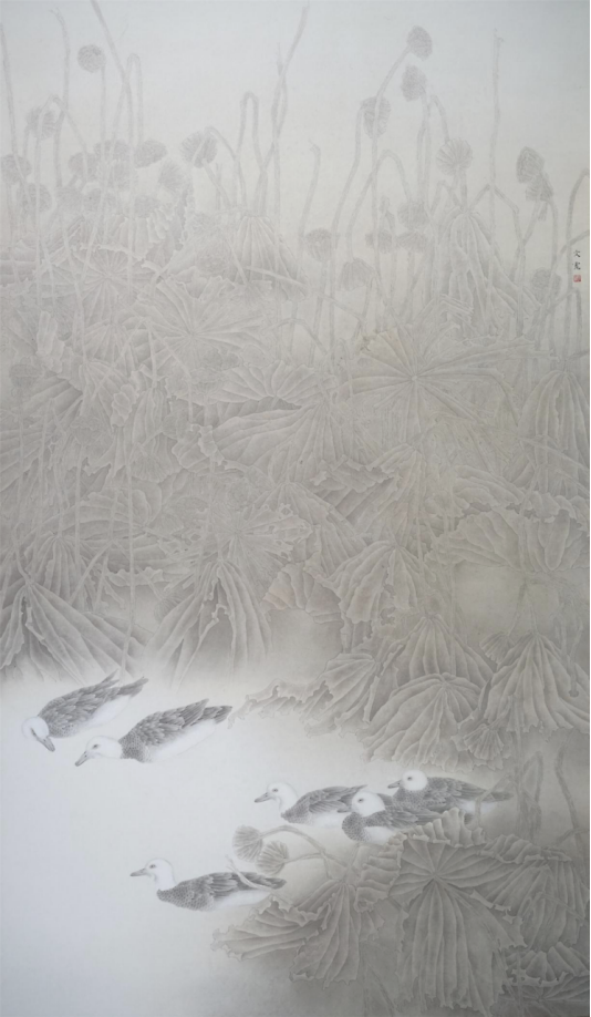 庄子云:“天地与我并生而万物与我为一。”也就是说人与自然始终处于一种和谐的,融为一体的关系之中。由此形成中国文化中的“以和为贵”、“中庸之道”等精神品质,渗透到审美意识中就是“万物静观皆自得”、“无为”、“不着意”、“以人之天而合天之天”,崇尚自然优美。由这种理论所产生的审美意识一旦用于艺术创作,必然会产生独特的事物观察方法和表现方法,而结果展现的这种艺术往往有区别于其他艺术的本质特征,这就形成了中国画是最具心灵化的艺术。总之,境界越开阔,艺术品味就越高。画家施文虎在艺术创作中最重要的不是呈现外部世界,而是倾听自身心灵深处的声音,感受灵魂的触动。只有用心灵去勾勒每一条线条,用情感去渲染每一笔颜色,才能赋予画面拥有灵魂,使作品充满魅力,熠熠生辉。