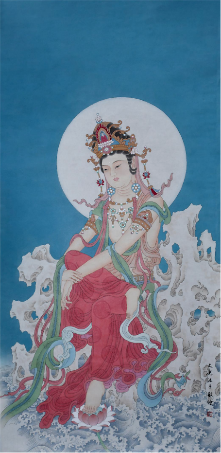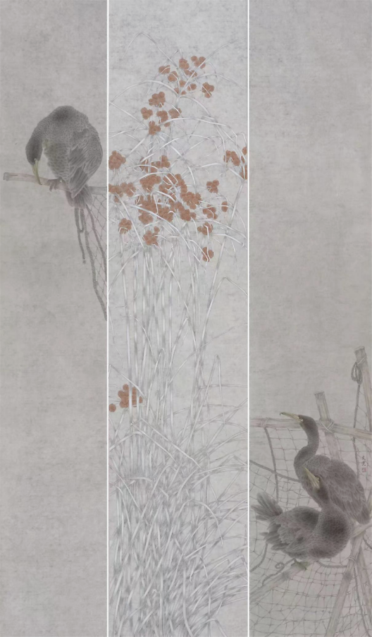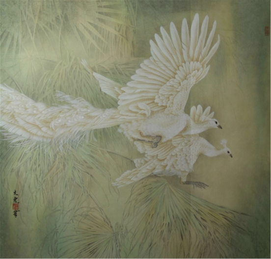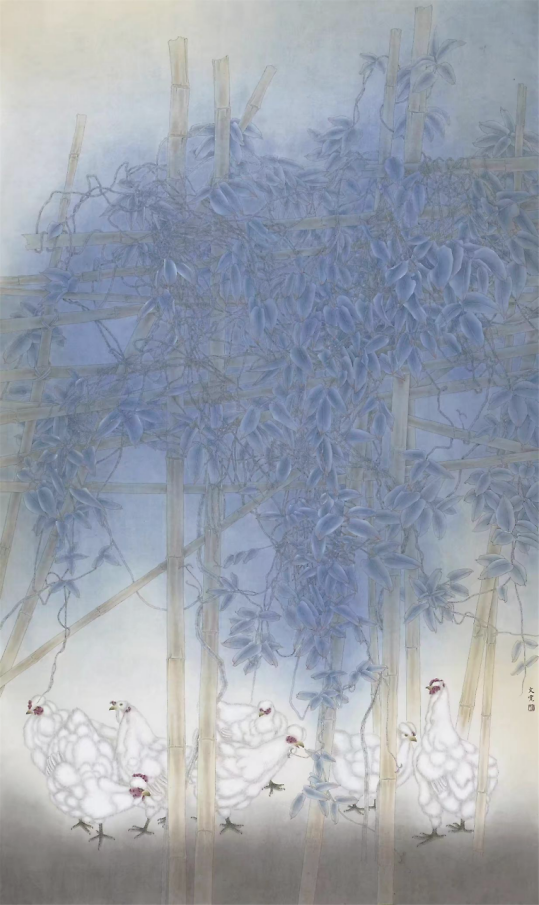 从中国画的传承史上,中国画可以把纷繁复杂的客体,如自然的色彩、明暗、体积等都过滤为“空白”,而中国画又恰恰是以空白为基色,在空白中大做文章。空白就成了意象的重要内容,不仅可以成为意象的空间,还可以成为其他意象的物体。空白可以在画面中作为意象的江河、大海、平原、山川、烟霞、云雾、瀑布、衣服、皮肤、器皿等一切客体,只要画面需要,都可以把客体中丰富的色彩、浓淡、明暗、体积等过滤成空白,从而达到意象性的目的。空白不仅可以当做烈日炎炎的白昼,也可以当做伸手不见五指的黑夜,随着画家给画面主体限定的范围而变化。它既是无形,也是有形,这形存在于观赏者的联想之中。空白是人的心理空间,它的价值在于虚胜于实、无胜于有、简胜于繁。因此,要解读画家施文虎的工笔画作品,就要从他的色彩构造和心灵变化去透析。在画家作品的整体画面上,呈现最多的是色块的渐变构造,其中并不是没有线条的构造存在,而是画家特意用色彩去把线条模糊、淡化,内藏于画中色块间,然而在色彩上更好的去和谐整个画面,使时空的穿透性更加的强烈,在空白中染变空间虚实,在模糊的无形中塑造有形,以达到自身感受之中的意象空间,这样的意象充满穿透性、可变性和塑造性,演化高层次的意境。