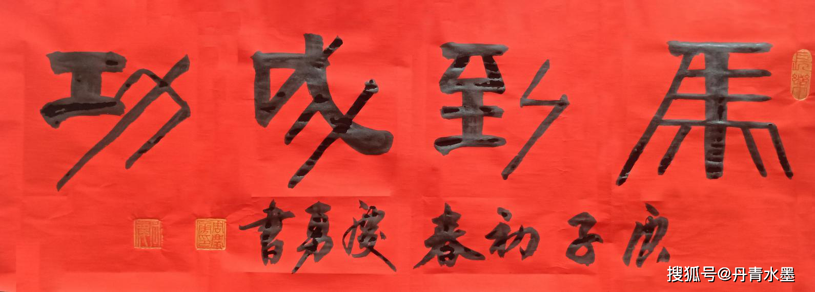 观其篆书,是谓新奇,作品中从结构到布局,都别具一番新意。每一个篆字的起止转折,亦是交代得极为清楚,笔路清晰干练,笔力运用到位,字形干净利落,精干劲挺,通幅字体结构,时伸长时规整,取势苍劲古茂,清劲圆畅。周庆勇的篆书,最大限度地呈现了笔墨的特质美感,细节上精心安排,形态上别出新意,使众幅篆书在传统的平正中变得更加遒劲有力,神采飞扬。 榜书展雄风,篆意具新格。学艺无界,翰墨润香,笔随意至,形具神生。习书者若想在书法上有所突破,就必须修心修身,以达性灵之境,如此身心淡泊,杂念全无,自身书法才能达至境矣。周庆勇先生正是这样一位书法深达至境的翰墨大家,他的书法,形神兼修,技道并进,一幅幅精妙书作,映照了他坚实的习书足迹,书韵自然,意博高古! 子曰美术馆艺术顾问 孔令仁