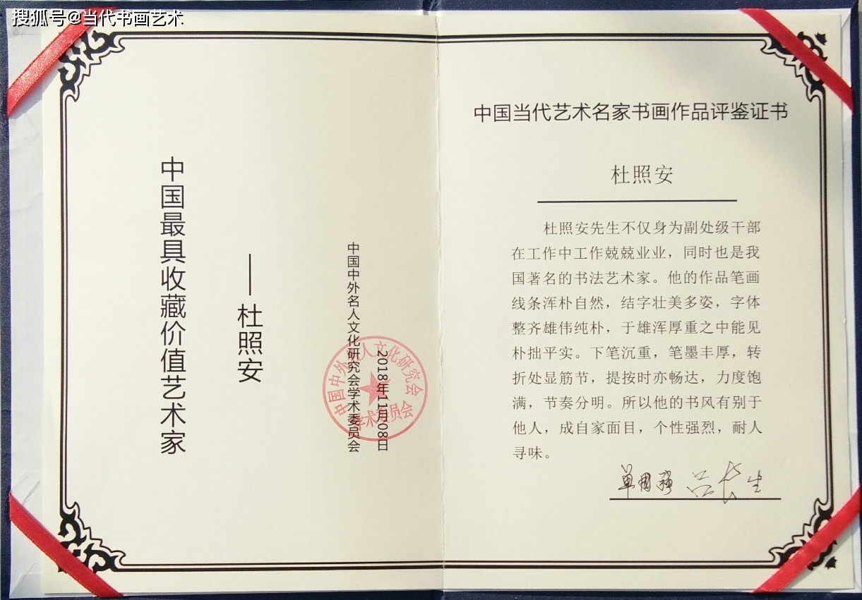 杜照安,男,汉,1945年9月生于山东省济南市、长清区、双泉镇、庞庄村。副处,中级,原莱芜市(地级)第十三届人大代表。现为《中国楹联学会会员》;《中国民族建筑研究会会员》,证件编号:FYRZ0100010115G,《中国文化金融发展联合会(理事长)》,《国家特级书画家》档案编号:BZGwL202010280021J ,《中国书画家联谊会》(新文艺群体书画家工作委员会会员)》,《中国文艺协会理事》,《中国老年书画研究会会员》,《人民日报社(人民美术艺术家委员会委员)》,《中华民族振兴基金会常务理事长》,《中国传统文化诗书画协会理事》,《中国国学书画研究中心副会长》,《世界华人书画名家协会终身会员》,《中国当代艺术出版社特聘终身副社长》,《中国国际书画研究院院士》,《新时代大国领军人物》等。作品、辞条先后入编《世界名人录》,《世界艺圣(合集、专刊)》,《中国艺术百年(张大千、李可染、杜照安等十人集)》,《中国传统文化非遗传承人》《岁月如歌――当代书画泰斗二人行(沈鹏、杜照安双人集)》,《中华国粹――翰墨至尊(刘大为、杜照安二人集)》,《一代宗师(梅兰芳、杜照安专刊)》,《人民书画三大家(苏士澍、范曾、杜照安三人集)》,《国学鲁源大典(范曾、杜照安专集)》《大师风范(啟功、冯远、杜照安十人集)》,《笔墨人生――中国艺坛巨子(杜照安书法专集)》,《书法美术(教材)》,《中国当代艺术大家》,《中国书法家作品选集》,《中外哲理名言(3、4)》,《中华名言词典》,《唐诗三百首(修订版)》,《中国美术选集》,《国内外邮票珍藏册(数集)》,《世界古代艺术名家大典》,《中国书画家报》,《中国楹联报》,《中国企业家日报》,《艺术人物》等二百余部典籍。并先后荣获国内外略干奖项和荣誉称号,书作小篆《兰亭序》入选并镌刻在(中国八达岭新长城上)永久展示,永载史册,编号:0266;多幅书作入选并烧制在(国礼艺术瓷瓶、瓷盘上);作品先后被国内外文化机构、博物馆和友人收藏。《中国百度》,《百度百科》,《美术百科》 ,《中国网》,《人民网》,《中华网》,《新浪网》,《凤凰网》,《中国八大岭新长城官网》,《中国经济网》,《中国财经网》,《中国企业报道》,《今日头条》等数家媒体宣传报道。经中国文学艺术界联合会文学评估中心润格评估,市场价格人民币为42000元/平方尺(至)60000元/平方尺。档案编号N0:BzGWL202010290021J