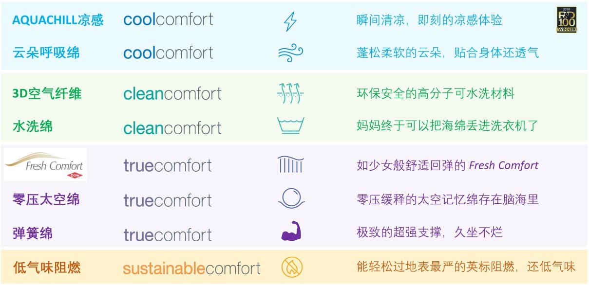 其中云朵呼吸棉(VoraZzz)在第三届在中国国际进口博览会上实现亚洲首发,VoraZzz运用舒适科技制成,用AIR-CELL 技术,保证了高透湿性、高透气性,保证设计到海绵上的每一个“呼吸孔”,零阻塞,让空气实现自由流通。即使压缩状态下,BREATHABLE 云朵呼吸绵 依旧保持透气性。0.2秒迅速带走汗水,“会呼吸” 的海绵不需要打孔。Breathable Vora Zzz™ 黑科技 入选2017年全球 “R&D100” 奖项的决赛圈。 |