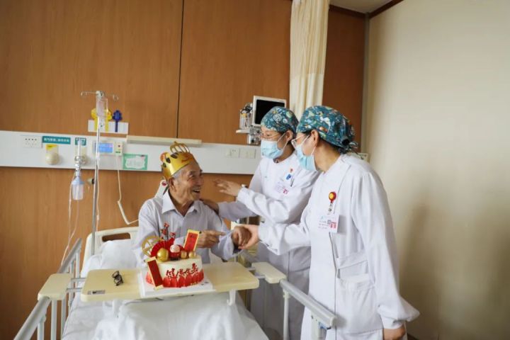 生日对于每个人来说都有重要的意义 今天 在保健三科病房 90岁的程永津爷爷迎来了一场特殊的生日会 ![]() 程永津爷爷在家摔倒后头晕、四肢活动不灵入院入院后烦躁明显、偶有意识不清急查颅脑CT示:蛛网膜下腔出血 程爷爷于当天夜间突发 意识丧失、口角抽搐、呼之不应 面对曾经为国征战,出生入死的老战士 医务人员心怀深深地敬仰 全力以赴投入到抢救中 ![]() 经多学科会诊 急行经气管插管有创呼吸机辅助呼吸 心电监护、升压、抗感染等一系列治疗 程爷爷慢慢地能点头回应医务人员的呼唤 能说简单的“喝水”“翻身” 能在床上小坐一会儿 再到后来能说话、能走路、能吃饭