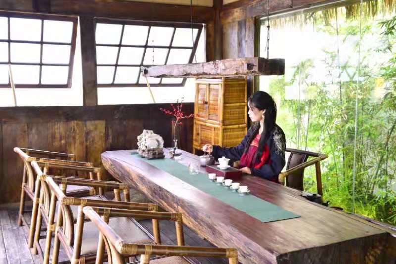 山居煎茶 碧水东流去,青山曲径斜。 野滕缠木屋,方竹倚窗纱。 窈窕天仙女,氤氲建盏茶。 流连难尽兴,日落不归家。