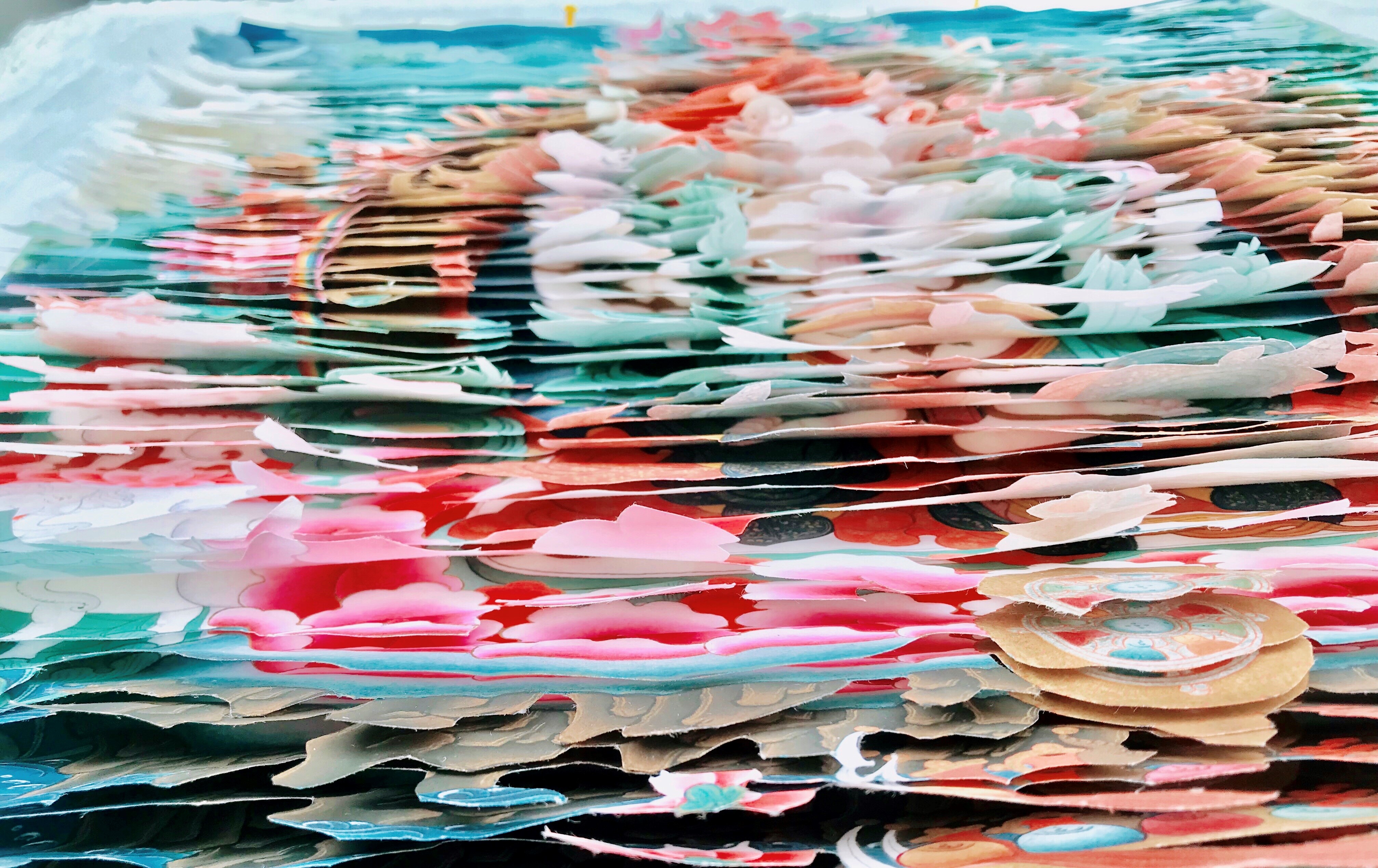 这本龙鳞装书籍,特殊装订的一面书页仿佛整齐排列的鳞片,轻轻翻动,一幅画会慢慢消失,另一幅画会逐渐显形。“这是很有禅意的一种表达方式。同时再去阅读里面的经文,会给人一种身临其境的感觉。”十多年研究龙鳞装,张晓栋恢复并改进唐代龙鳞装装帧技艺,获得书籍发明专利20多项,还在2019年以特邀参展艺术家的身份参加了威尼斯艺术双年展。之后,张晓栋又耗时四年制作了经龙装《红楼梦》,经龙装是传承中的创新,结合了经折装、龙鳞装两种装帧艺术的优点而成。