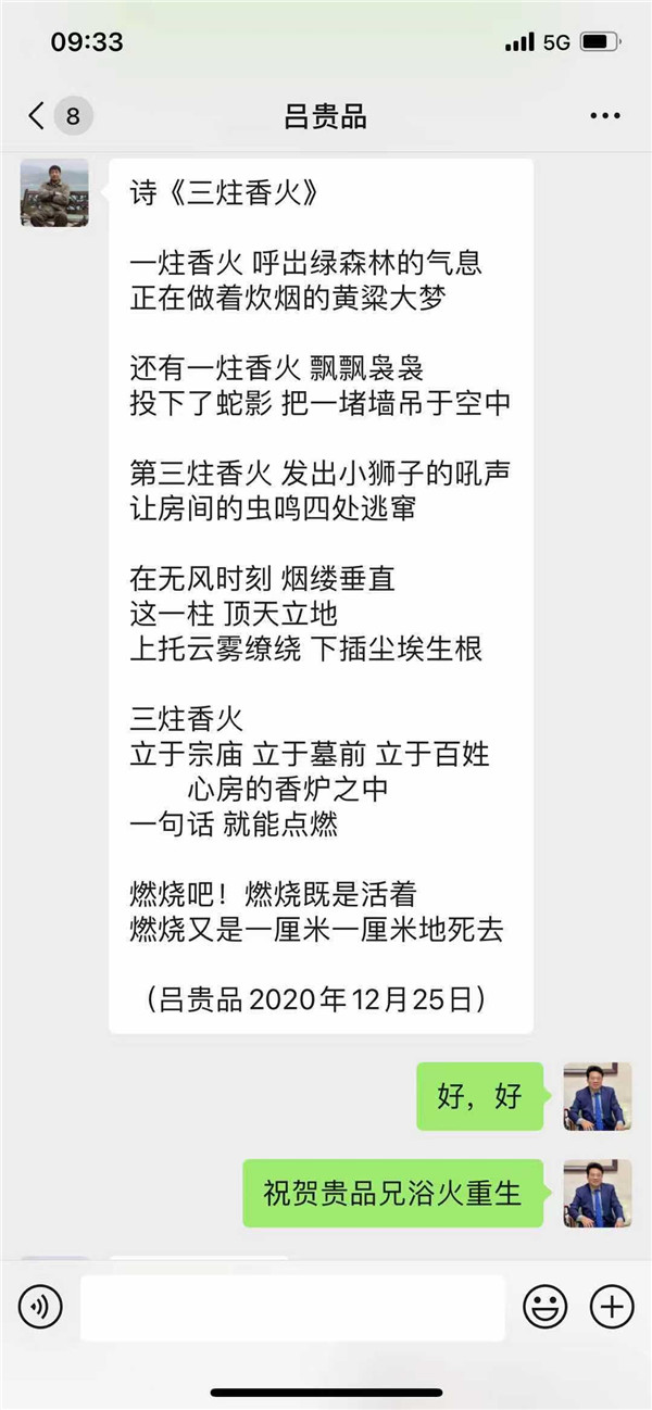 肾坏死多年,完全依靠透析维持生命的诗人吕贵品先生,庚子年过的更是不同寻常。换肾手术后,2020年10月2日,坚持每天一首诗的贵品兄,突然停止了诗歌创作。 这让人很是揪心,不敢微信寻问情况。至少肯定无法拿不起手机,去记录内心的诗潮澎拜。我想如果有百分之一的可能,贵品兄,绝对不会放弃。只好私下悄悄问贵品兄的结义兄弟葛宏津先生,得到答复,并无异样,才稍舒了一口气。记得我的好朋友阮次山先生就是换肾后,一直没有彻底消除排异反应,所以,又难免隐隐约约的担心。 直接85天后,2020年12月26日10点43分,突然收到了贵品兄《三柱香火》: