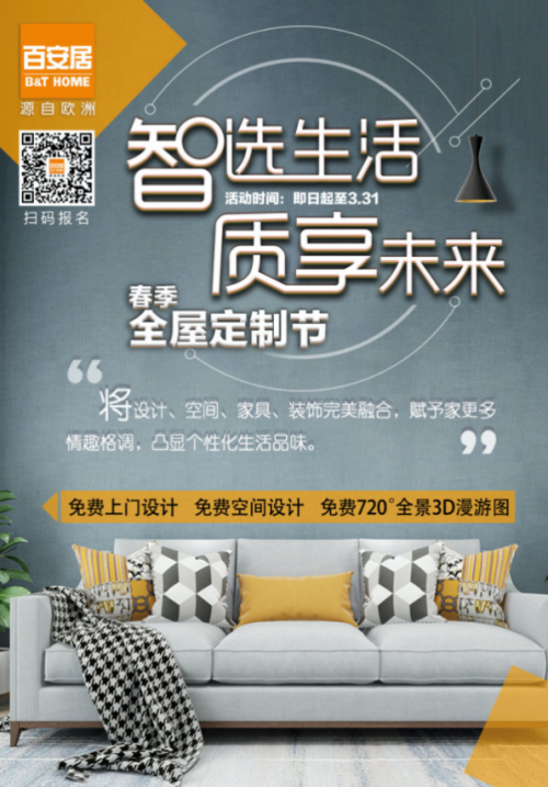 为了让更多消费者能享受到更专业、更时尚、更环保的家装服务,百安居特此还推出包括全案设计、装修补贴等活动。活动期间,凡是在百安居签约消费,即可免费获得包括全屋环保检测、全屋设计方案、全景漫游图、环保装修检测、水电延保一年以及高达万元软装套餐券在内的签约好礼。此次百安居以普惠的活动形式回馈消费者,消费满足一定额度,可享定制好礼,让消费者切实享受到全屋定制节带来的专属礼遇。
