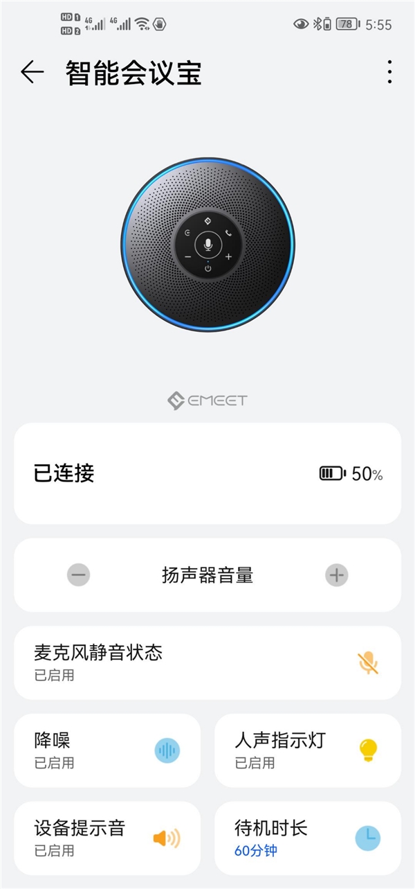 我手里的这款由于是跟华为鸿蒙生态鸿蒙智联的合作,产品在保留原来功能的基础上,可以让手机的用户通过华为智慧生活APP一键唤醒OfficeCore M2并对其进行设置,这边打开华为手机智慧生活APP的实际体验效果的确是方便了很多,可以在智慧生活上查看产品的电量使用情况,可以调节声音大小,自定义设置提示音,DOA,VoiceIA降噪的开启关闭等等,用户可以根据自己的实际需求去自定义设置,比如我,就利用智慧生活APP关闭了提示音,因为本身的灯光交互已经满足了状态提醒,我会感到提示音略显多余。