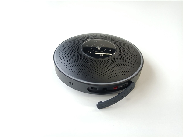 侧身是四个麦克风网孔等分分布,以及充电口,级联口,AUX口,锁孔都一起藏在硅胶下面,保证整体产品设计的一致性。拿在手里,如果是男生的手就可以一手握住,还配了一个便携袋,基本做到了小巧便携,可以随包携带。重量也只有300克,不会太重也不至于太轻,拿在手里的感觉刚好。