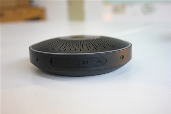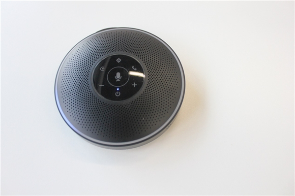 拿到产品,我们可以看到整个圆形的设计是类似飞碟,A面的网孔分布跟按键分布也是极其讲究,整个设计都很极简,之前网购的时候就上过不少产品精修图的当,实物材质廉价和细节粗糙,和图片相比相差甚远。OfficeCore M2在细节上还是很经得起推敲的。正面是航天铝合金金属材质,整体产品金属质感很强,很凸显商务精英气质。中间按键呈环形分布,是触摸按键,而不是传统的机械按键,整体的一致性跟质感又进一步凸显了。