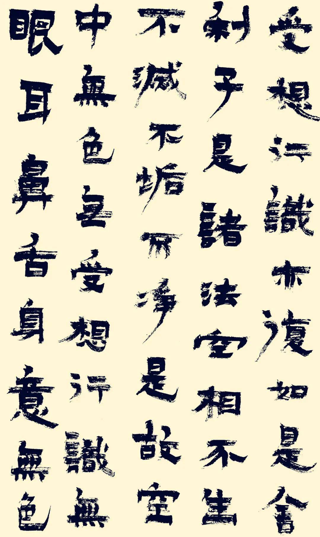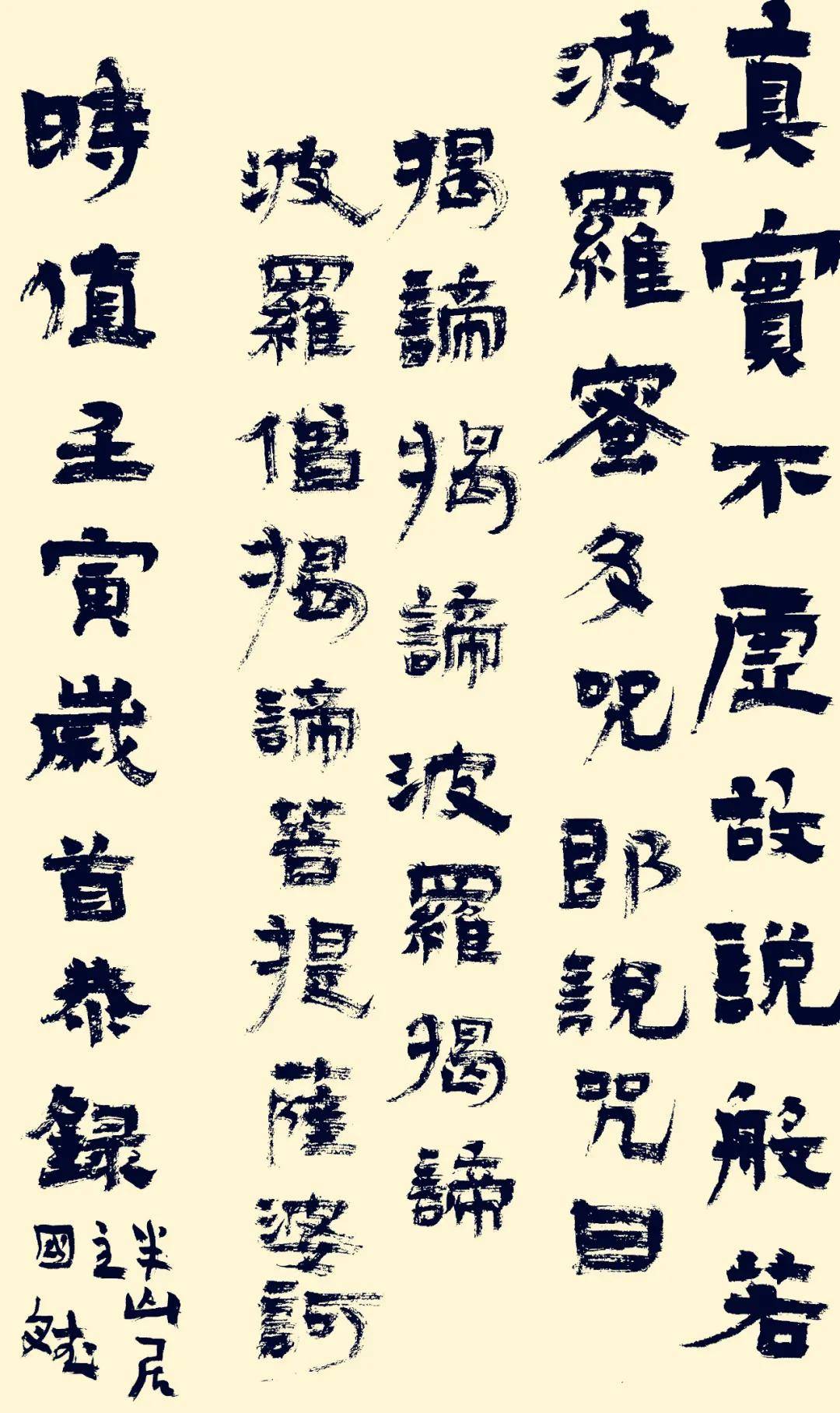 正月初五,立春後第二日,觀國斌兄隸書新作《般若波羅蜜多心經》,有春天奮發向上鬱勃之氣,豎有行橫無列,大小、粗細、寬窄、枯濕、方圓、開合信手拈來,書寫性極強。尖筆長挑、行筆、字勢貌似金冬心附體,實則來自《好大王》、《爨寶子》、《全掓積玉橋》、《嵩高靈廟》、《龍門二十品》等諸家。由此可窺國斌兄之霹靂手段,才高八斗非常人能為,佩服!