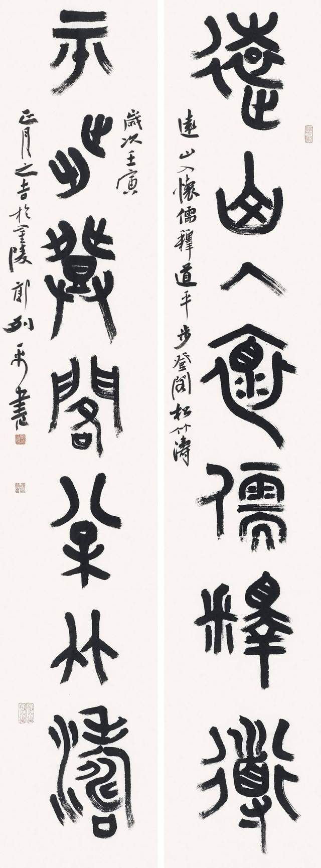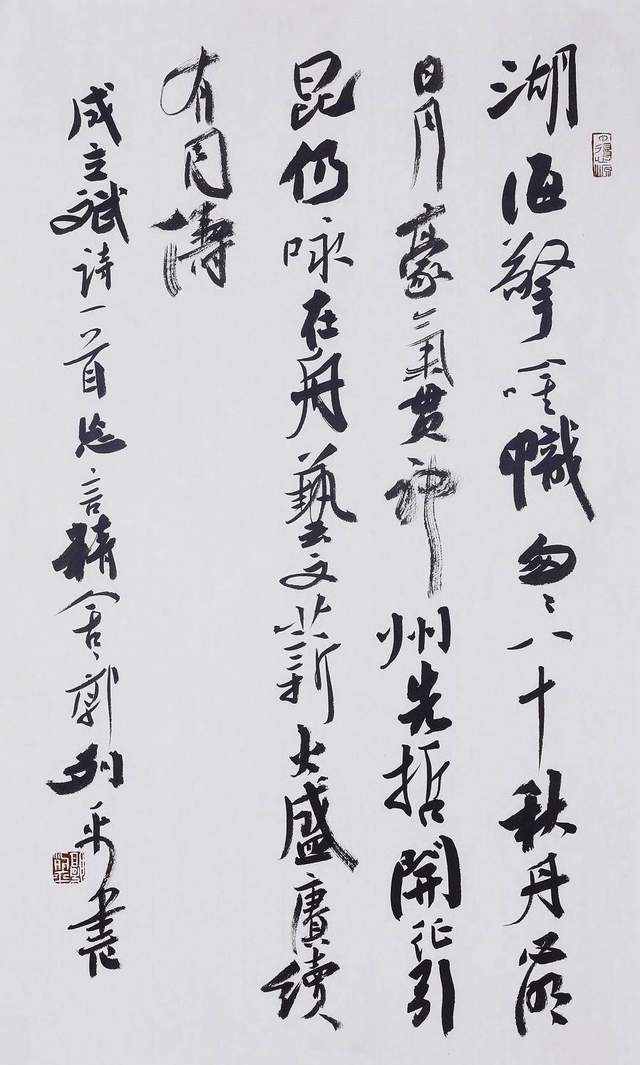 余所以谓郭列平先生之书是壮年之书,是称其虚集空灵。书何以谓之虚集空灵?庄子曰:气也者,虚而待物者也。唯道集虚。虚者,心斋也。凡书家作书,不能从大处着眼,小处着手,终不是大高手。以虚为道者,书作才有空灵之美,灵秀之气。郭列平书法是以雄肆之笔构造空灵之境界。其笔下大开大合之处,自是波澜壮阔,笔挟风雷,然行间中锋,飞白吐露,浓淡相宜之际,又见皓月千里,静影沉璧之景象,更使人叹为奇绝之处。蔡邕论书《九势》曰:势来不可止,势去不可遏,唯笔软则奇怪生焉。郭列平先生之书法,正合“来不可止,去不可遏”之诀,然其所构造之空灵精微之境界,当正是“奇怪生焉”。