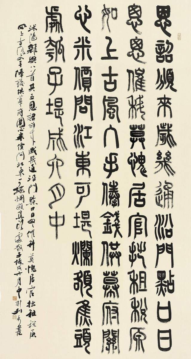 试以郭列平先生书法说之,养墨以灵,活笔以神,虚实相生,吐纳纷纭,大云覆宇,中含古春。其更是以厚积之法而涵养虚灵之气,修身之则以见俊逸之态。其笔底壮阔恣肆,纷披浑厚,一往无前,滔滔不竭。余所以谓郭列平先生之书是壮年之书,是称其厚拙。书何以谓之厚拙?必是积累而成也。郭列平之书法,由篆入草,由草入隶,更由隶入行,三者相互融通,使篆有草灵动之意,而不拘泥呆滞;草有隶高古之气,而不轻浮滑脱;隶有行清逸之味,而不僵硬板实,三者相互变通,相互印证,才见其书法精彩之处。遍及诸家,裁成一象,由是厚拙古淡,方是此大手笔也。