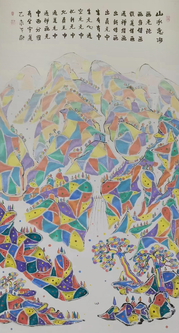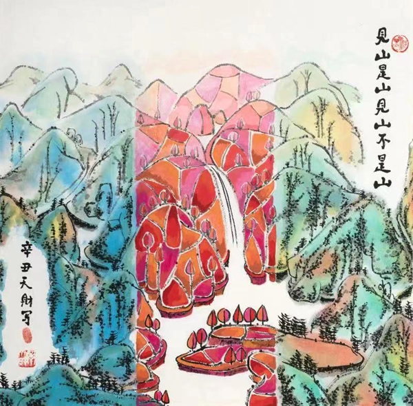 新真禅道画派,很在胆识、极有智慧地突破了中国画千年范式的束缚,带着借古开今的创新动能,走出了一条中国画与国际艺术完美接轨的伟大路径!比如《见山是山见山不是山》这件很有禅意的中国画作品,在创作形式上则很有胆识地打破了传统中国山水画的空间构成范式,带着莫奈画《日出》的印象主义风格,给中国画国际化、现代化量身定制了一件新的文化霓裳。让“中国禅”与西方审美的“印象风”相当完全美地镶嵌在一起,融为一体,合二为一!这种作品里的文化元素与文明密码是可以打动全世界的艺术要妙!