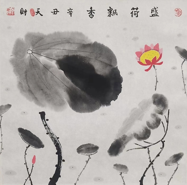 让中国画与国际艺术接轨,在于丁天财有博修中西文化的饱满才华。他对世界文明的走势理解很深刻,判断很准确。比如他画成的另一件作品《二祖调心》这是中国文化主题,在表达这个主题的过程中,他有意识地借鉴了毕加索立体主义的绘画结构,并且这种借鉴是无痕式的、是自然的、是巧妙的。拿捏准了立体主义的表达玄机,丁天财借助山水作品、人物作品、花鸟作品的独特创新,也就拥有了中国毕加索的地位。这样的作品不仅仅是现代化的经典,也是国际化的典范。他用世界可以看懂的美术秘籍,构建起令中国画可以大步进向国际的新真道禅画派体系,这是中国文化强起来的福音。于是,像《老子悟道》《禅梦荷》等等作品,就会成为中国美术作品在国际舞台赢得天价的必然!