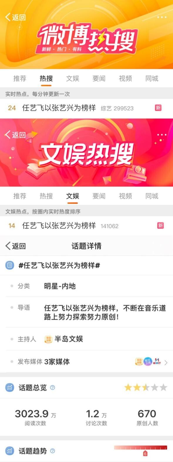 第29届东方风云榜音乐盛典任艺飞荣获“本地杰出歌手”,在发表获奖时他表示自己在国风电子上一直有一位榜样,那就是张艺兴 !自己的国风作品《虎将》也正在走向大家的视野中,期待他的更多作品!任艺飞以张艺兴为榜样的视频很快传递到微博热搜第24名,超过3700万人点击观看了视频,张艺兴的粉丝也纷纷表示:优秀人总是相互吸引。