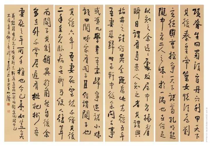 行书《归有光项脊轩志节录》。此作书写工具为长锋羊毫,而长锋羊毫较难驾驭,尤其铺毫顿笔极易软沓、弯折、散锋、偏锋。而王清喜用长锋羊毫,且颇有心得,已然得心应手。其用笔多以笔尖入纸,加上提按、波动、逆势、涩行,随提随按,随按随提,故能笔笔中锋,笔笔入纸,笔笔有摩擦力、阻力感,却不觉滞凝、拖沓,势全意存,神采奕奕。观其线条,凝炼、老辣、苍劲、朴茂,金石味十足。有美学家论:书法是线条的艺术。有审美价值的线条应是骨、肉、筋、血兼备,厚度、力度、立体感、动感、情感共存,且富有生命色彩,可以成为独立的审美对象。一根出彩的线条足以打动人,让人玩味再三。34年前,我和王清曾在长江边上的沙滩上一起讨论锥画沙、屋漏痕和万岁枯藤等话题,虽然当时是一知半解,但今日看来,这些术语,这些传统书法理论中的典型意象譬喻,早已烙在王清的艺术思维中,渗透于他的艺术实践中。书道中人,皆有同感。善小字者,往往不能展大,我曾见过许多帖学高手,写小字精致、典雅、流美洒脱,富于韵味,而写大字则往往精神涣散、琐碎、支离,稍大便俗,越大越俗,几不能卒睹。个中原因,当与取法单纯,纯取帖学一路有关。而碑派书法或出摩崖峭壁,或出山体大坪,多呈沉着屈郁,峻拔奇伟的雄壮气象。即或青铜铭文,碣石碑刻,砖石墓志,造像画像题记,刑徒砖文,黄肠题凑等亦自带金石之味,故以碑的笔法、气度贯穿相助,多能致大、致刚、致雄。此作用笔拙,字态也拙,多欹侧、险绝,左倾右斜,趣味横生,富于动感和表情。一字之中,虽有大小、轻重、松紧、粗细、参差、重心错位等变化,其核心便是一个拙字,随处以拙为尚,以拙为巧,以拙为美,由拙而生妙、生趣、生态、生情,生出丰富别样的美,生出让人意想不到的美。如此丰富的造型变化,需要超强的艺术想象力和表现力,这除了得益于先天艺术气质和独特禀赋外,更多的是作者善于从古人的作品中去发现、吸取、改变、调整。显然,八大的启发和影响是非常明显的,但近现代诸家,如于右任、沈曾植、谢无量、徐生翁、赵冷月等也是其关注取法的对象。傅山云:“写字无奇巧,只有正拙”。王清深谙此理,此作为六尺八条屏,每字10多公分,可谓大字行书巨作。这样的作品,脚怯者难为,气局小者难为,功力不逮者难为,需具备排兵布阵的大局观念,需要有丰富的创作经验,需要自信和胸有成竹。观王清此作,写得不急不厉、轻松淡定、纵横自如,毫无滞疑板涩之感。大字全然如小字一般写,游刃有余,神完气足。此作在整体章法上也作了丰富的艺术处理,字与字之间均有大小、轻重、穿插、腾挪、避让、动静、奇正、折使、顾盼、呼应的变化,从而营造出变化统一、和谐合律的节奏感。更为难得的是,创作如此的大幅作品,却能自始至终保持良好的状态,稳定的艺术发挥。全作几无懈笔,令是惊叹,堪称力作。王清行书倾心八大,二十多年耽于此,癖于斯,已能入其心,会其意,撷其精。然八大书法风格强烈,踵其者,往往难脱其窠臼。八大书法自帖学中来,总体而言,用笔多平动,线条简约、温润,弧线少,粗细变化对比不强烈,力量感稍弱。结构注重内在空间变化,新姿奇态迭出。对此,王清似早有认识,故自觉地探索将碑法、碑体、碑态、碑势、碑意融入进去,以期碑帖融合。如果将王清作品与八大的作品作一比较,无论线型、线质、线性、笔法运用、造型特征、字间组合、节奏处理均已突破八大的藩篱,俨然自成面目。看来,王清学八大是借鸡生蛋,旧瓶装新酒,可见王清善学、巧学的一面。