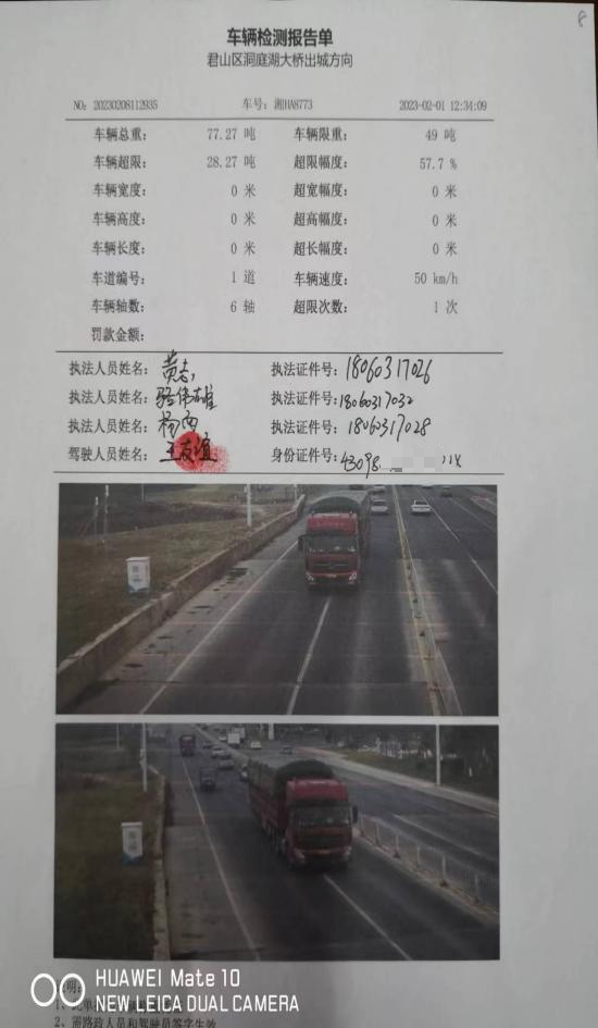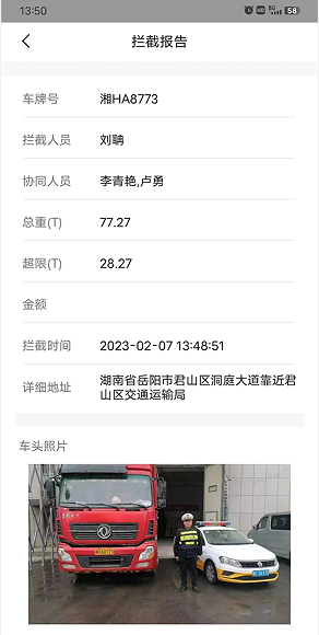 执法大队分管治超的副大队长卢勇立即安排治超中队长李青艳和执法队员段孝江、杨西、骆伟雄组织围栏布控,2023年2月7日13时48分在君山区洞庭大道工业园成功将该车查获。