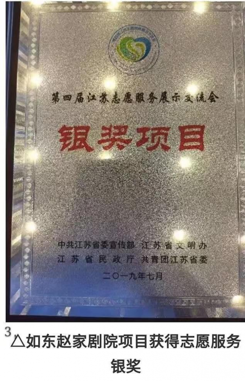 赵家剧院,不仅极大地丰富了群众的文化娱乐生活,而且有效地提高了百姓的法制意识和道德水准。赵家剧院以文化人,让不少乐意唱歌跳舞的人消除小病小痛:让300多位文艺爱好者走上央视,体验到高品位的精神文化生活:让一个个迷茫者醒悟,使一个个家庭破镜重圆,助力了乡风文明和小康社会。2019年获得江苏省志交会银奖:2022年被评为中国农村第一公益剧院:2023年被评为东盟最具影响力品牌。