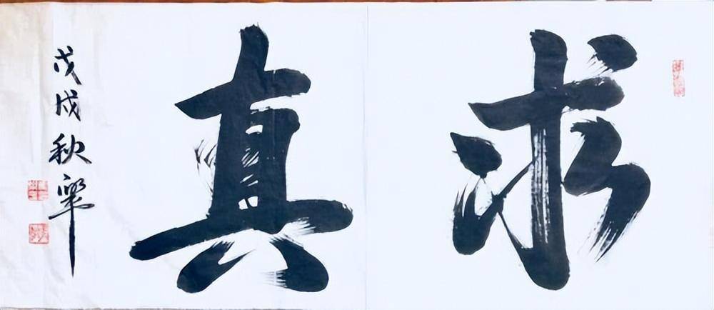 马乐平当场为我们展示书写了一幅榜书作品“求真”。只见他抚平宣纸,压上镇纸,手握斗笔,饱蘸翰墨,润润笔尖,沉思片刻,落笔疾书。他手中的斗笔像一条轻舞的龙蛇跃在纸上,似行云如流水,只见那点画如高峰坠石、横画如千里阵云、竖画如银河落水、撇画如陆断犀象、捺画如崩浪雷奔、斜勾如百钧弩发、横折如劲弩筋节,不一会儿,“求真”二字便跃然纸上。雄浑有力,霸气侧漏,微微带有行书的笔意,但基本上以楷书笔法写就,一笔一画斩钉截铁,骨力丰满,匀称简洁,凝重沉实,古朴劲挺,表现出雄秀雅奇、厚重朴实、潇洒秀逸的艺术特色。