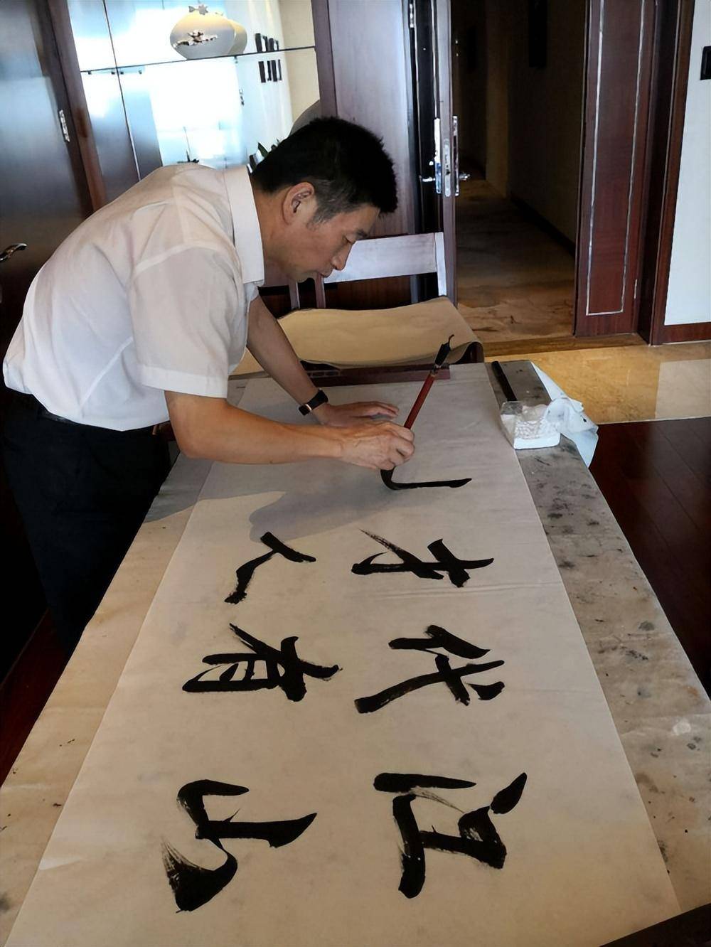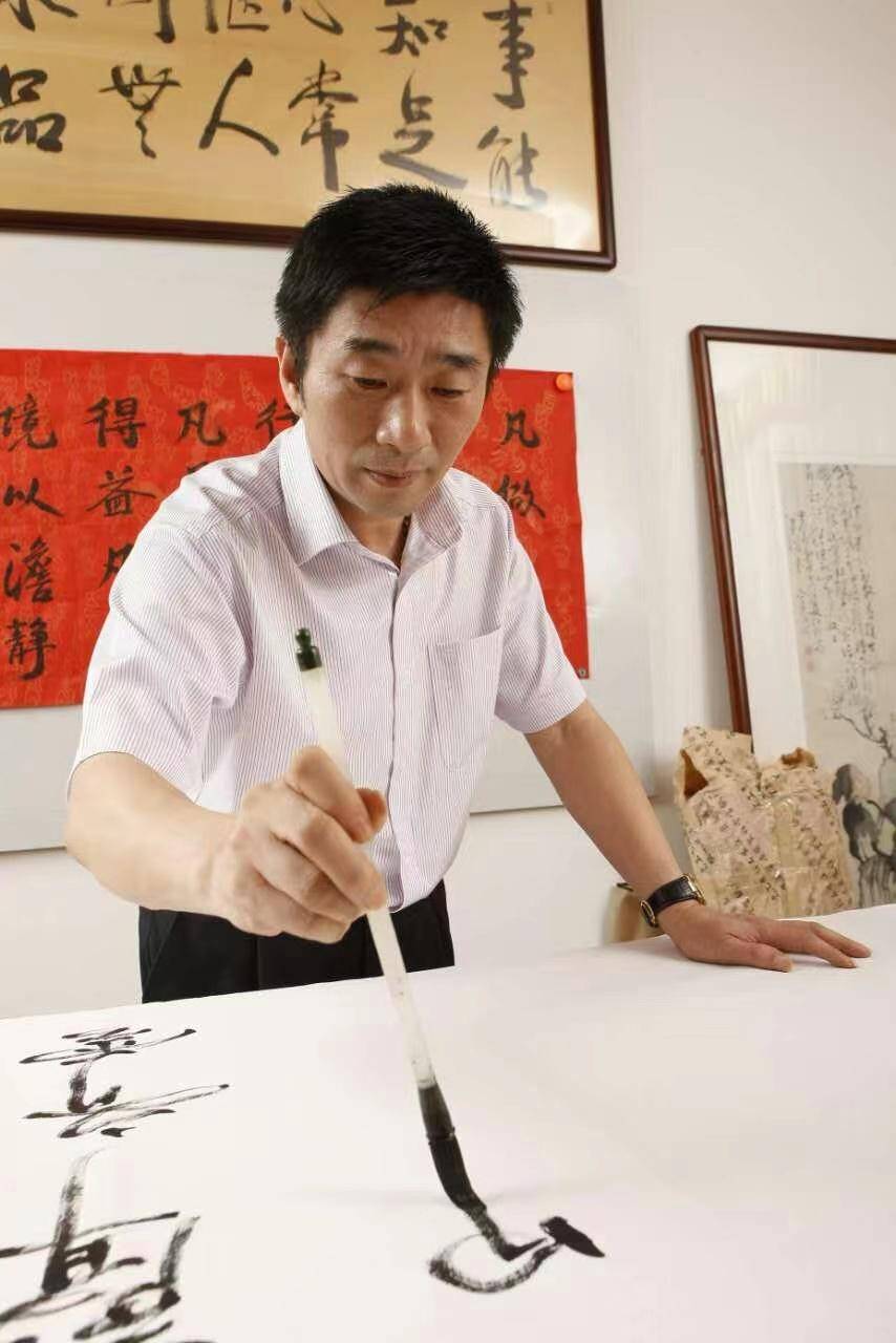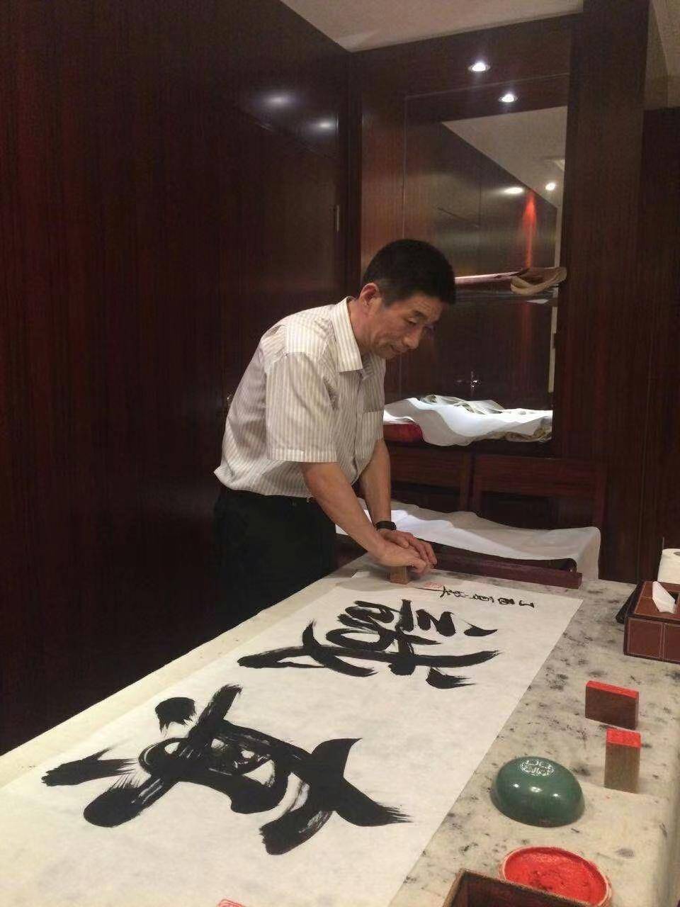 马乐平先生痴迷榜书,工作繁忙之际,每日即兴泼墨创作已成为他人生修行的必修课。榜书是实用性和艺术性高度统一的书法艺术,字大逾尺甚至径丈。他跟我们说,榜书之难,就难在一个“大”和一个“势”上。