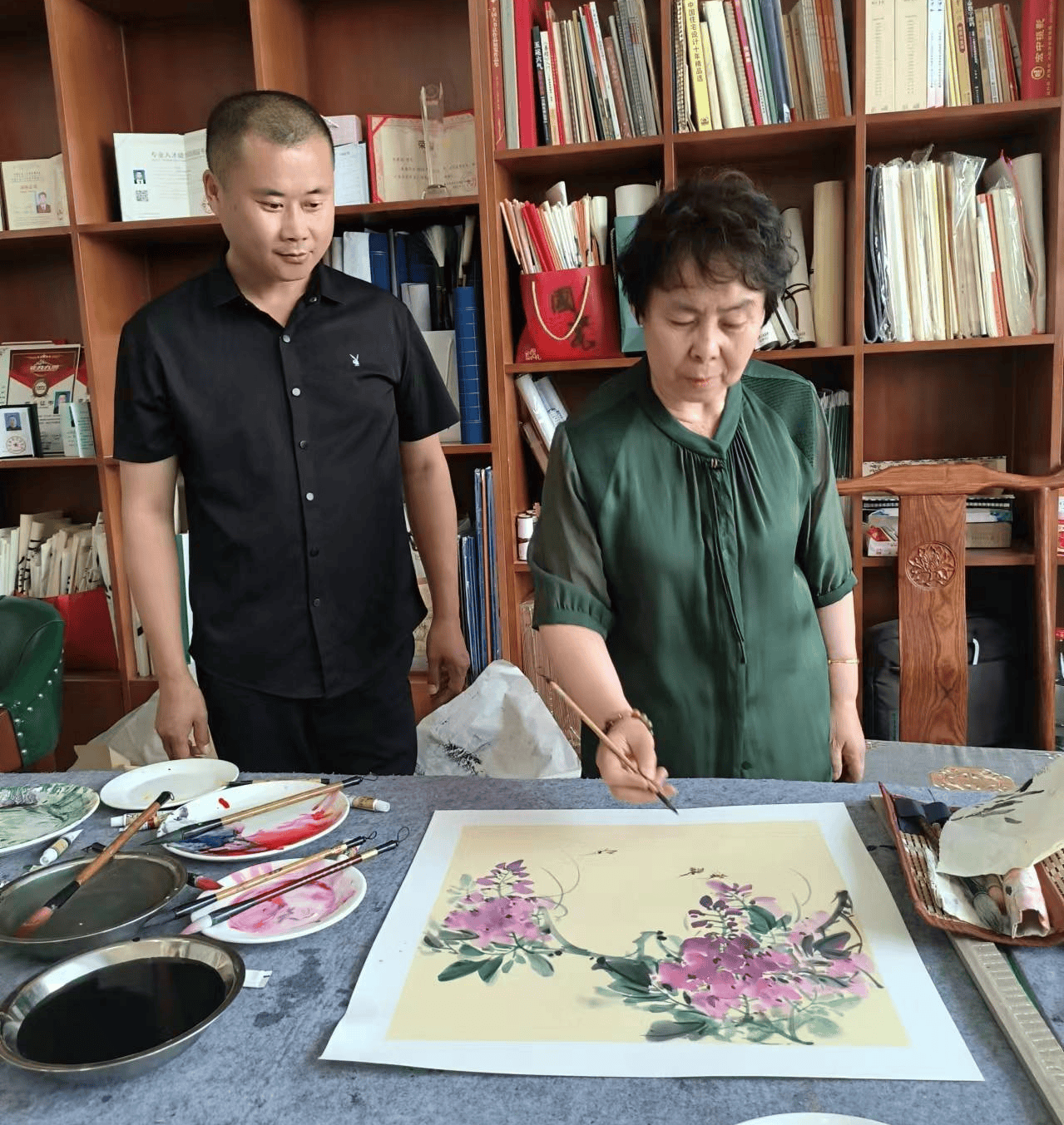 我与苑秀芬老师探讨了牡丹画的创作心得。她告诉我,画牡丹不仅要掌握技巧,更要有深厚的文化底蕴。苑老师以她深厚的绘画功力和独特的艺术视角,将牡丹的华丽、高贵、端庄展现得淋漓尽致。她的作品不仅传达了牡丹的美丽,更展现了中华民族的传统文化。与她的交谈让我明白了,艺术不仅仅是技巧的展示,更是一种文化的传承。苑秀芬老师感慨地说:主要还得感谢我爱人支持和信任,没有他的支持和鼓励也许我的书画事业得不到现在的成果。