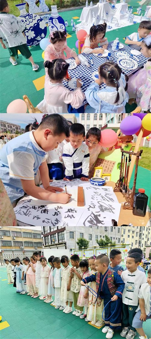每年六一活动都深受孩子们的喜爱和期待,为了弘扬中华传统文化,开展独具特色的传统游戏来装点孩子们的趣味童年!在“国风汉韵,志趣童年”游戏的快乐体验中,感受传统游戏的特色,在欢声笑语中,传承传统文化的生活趣味。活动现场还设置了多个互动体验区,包括扎染、漆扇、书法体验、青花瓷画、投壶、套圈,让孩子们在亲身体验中感受中华文化的魅力,激发他们对传统文化的兴趣与热爱。小朋友们在老师的指导下,或是挥毫泼墨,或是尽情投射,一张张稚嫩的脸庞上写满了认真与兴奋。
