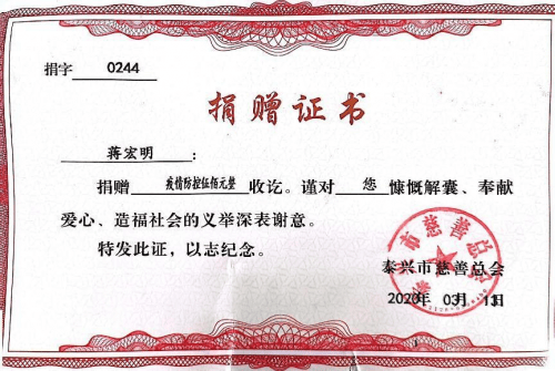 2018年2月1日,蒋宏明跟随市民政局副局长严飞来到泰州市民政局、泰州市慈善总会组织的“送年礼 结亲情”活动现场,资助了10位贫困者,并按照泰州市民政局部署,在春节前开车一百多公里,将年礼送到每个接受资助者家中。