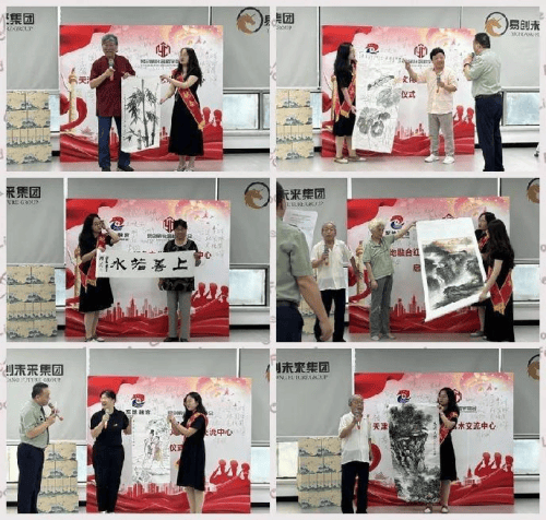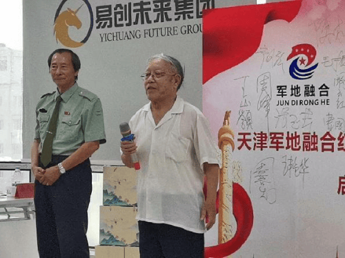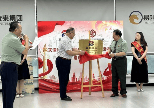 军地融合研究院毛振刚院长、易创孵化器楼宇商会会长王全有会长为“天津军地融合红色文化艺术交流中心”揭牌