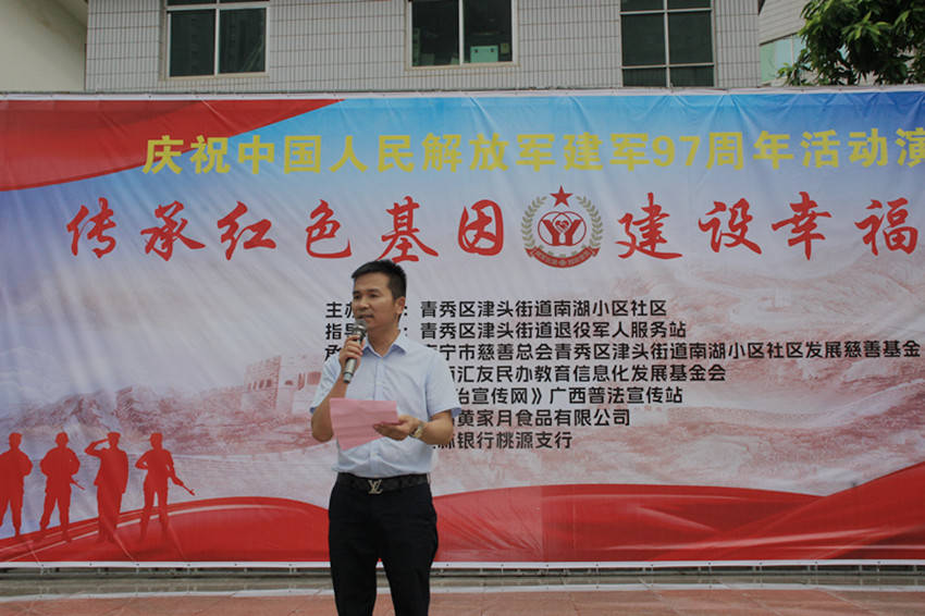 南湖小区社区党委书记韦灿斌也表示,此次庆祝中国人民解放军建军 97 周年红歌大汇演暨慰问退役军人活动,不仅是一场精彩纷呈的文化盛宴,更是一次深刻的爱国主义和国防教育。它一定会激励着广大干部群众在新时代继承和发扬人民军队的优良传统,为实现中华民族伟大复兴的中国梦而努力奋斗。