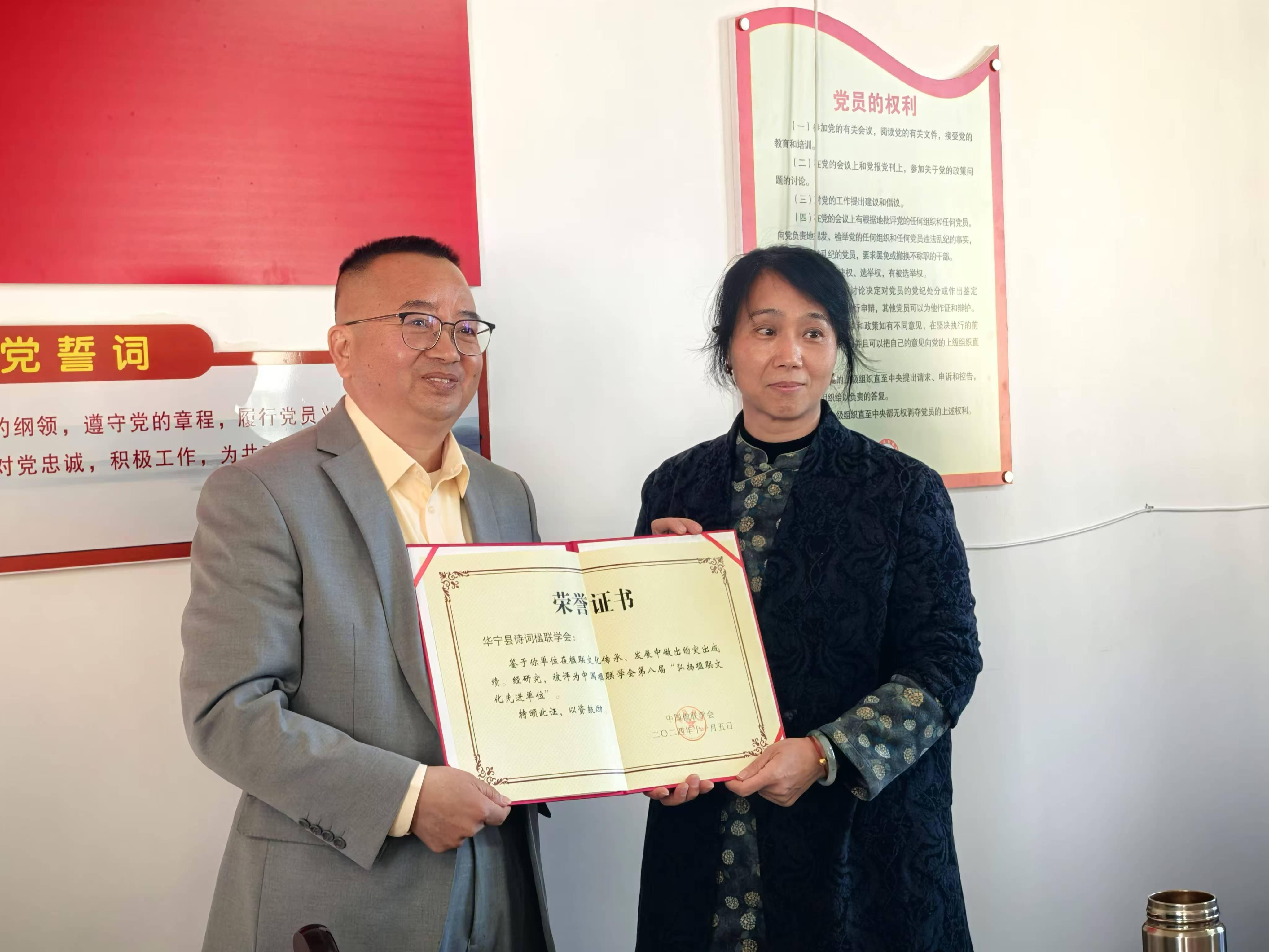 值得一提的是,省楹联学会副会长李嫦莉在活动中向华宁县诗词楹联学会颁发了中国楹联学会第八届“弘扬楹联文化先进单位”荣誉证书。这一荣誉是对华宁县诗词楹联学会过往努力的高度认可,也是对未来发展的殷切期许。