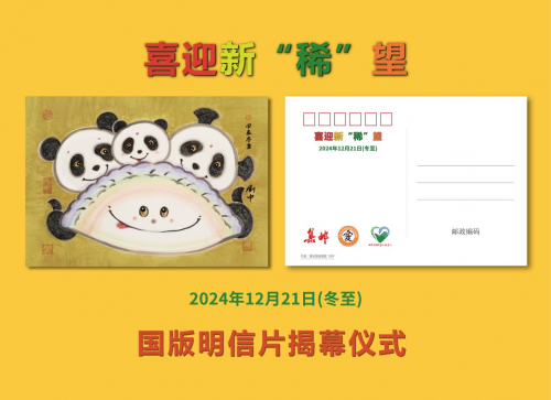 在明信片揭幕仪式上,刘中先生、丛志军先生、张建龙先生、张书丰先生等嘉宾共同为“喜迎新‘稀’望”国版明信片揭幕。该明信片图案由中国美术家协会理事、著名国宝画家刘中先生亲自设计并绘制,他用拟人的手法描绘“国宝”大熊猫一家三口品尝七彩饺子。画面中的饺子以七彩缤纷的样式呈现,寓意着幸福、财富以及对农历春节的期待,也代表着七彩人生,饱含着对美好生活的向往。三只熊猫则代表“熊猫血”志愿者家庭,他们用实际行动诠释着互助互爱的真谛,践行着无私奉献的志愿精神,传递出人间真情所蕴含的温暖力量。他们通过无偿献血,不仅弘扬了中国优秀传统文化的内涵,还彰显出民族的团结与凝聚力,展现了新时代人们对家国情怀的践行与美好追求。