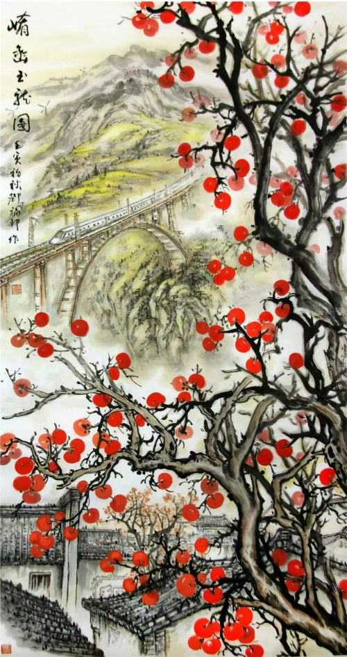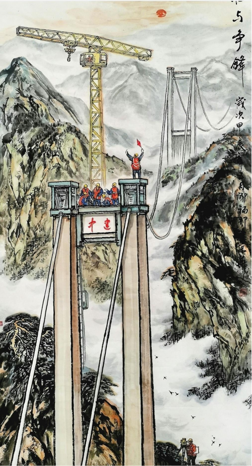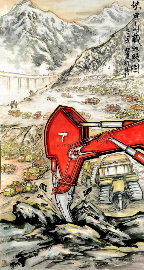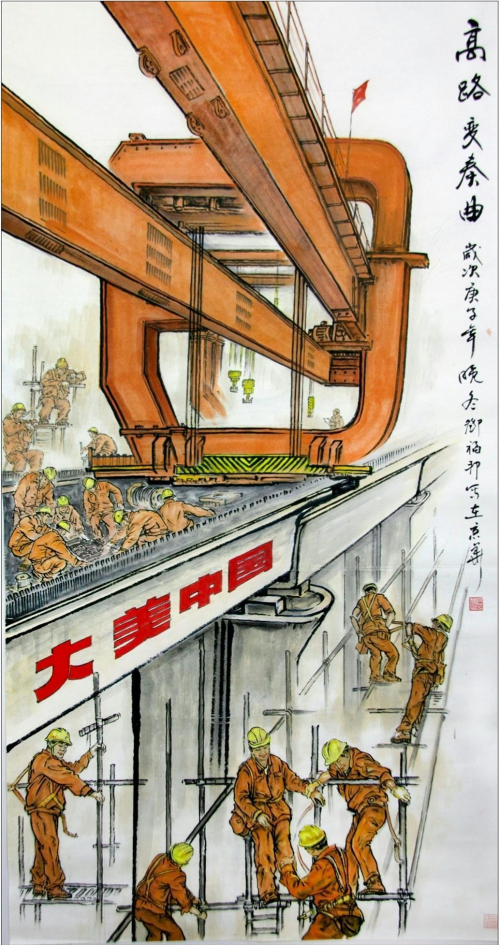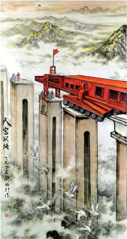 传统与现代的对话:邓福邦的作品并非固守传统,而是积极回应时代。例如,《大道琴音图》将高铁、现代桥梁等元素与传统山水结合,展现了中国现代化进程与自然和谐共生的主题。