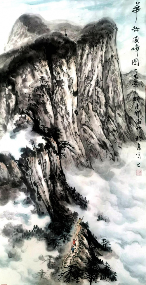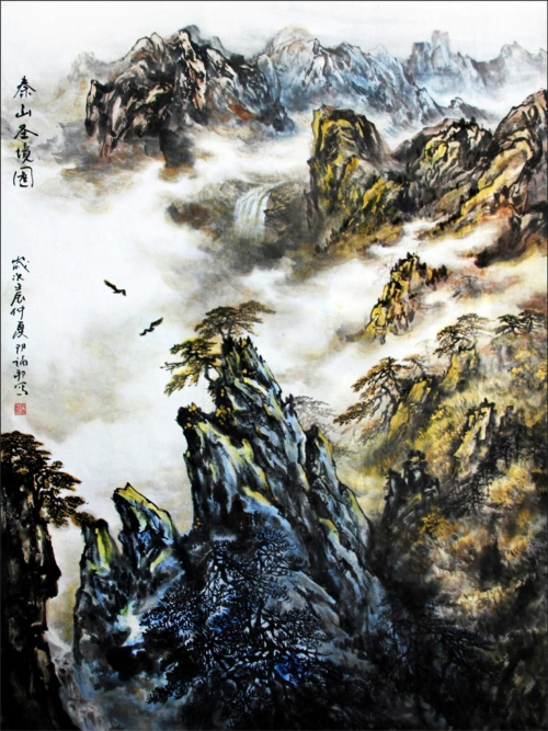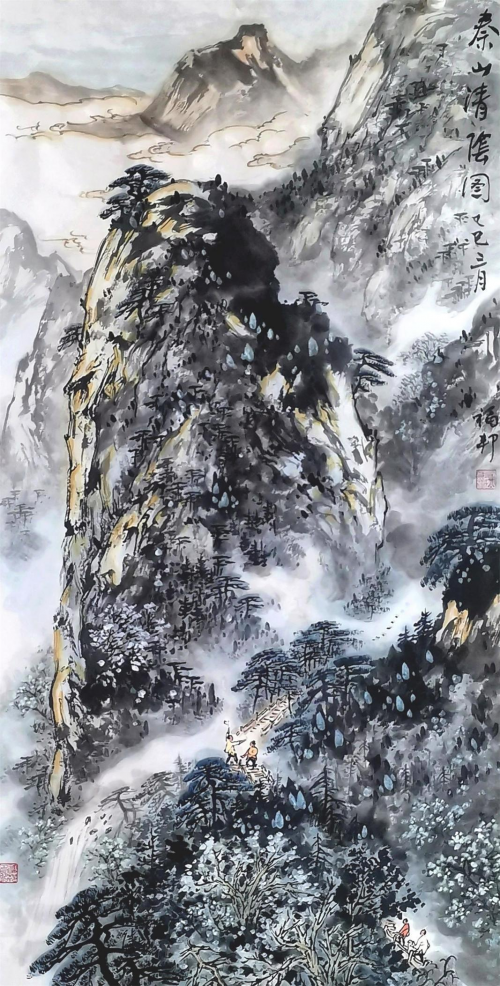 突破创新: 他在传统基础上提出“道化丹青”理念,将道家哲学融入艺术创作,赋予山水画更深层的哲学意蕴。例如,作品《秦山问道》不仅描绘自然景观,更通过画面传递“天人合一”的道家思想。