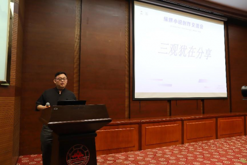 纵横小说签约作家三观犹在就当代网络文学叙事技巧进行了分享,他将技巧总结为叙事四器:悬念、反转、节奏、情绪,并利用生动的例子,深入浅出地将四器讲解透彻,现场反响热烈。他还谈到网络文学是信息熵很低的表达方式,所以网文作者创作的内容要通俗易懂。同时要站在读者角度,去理解读者想要什么。
