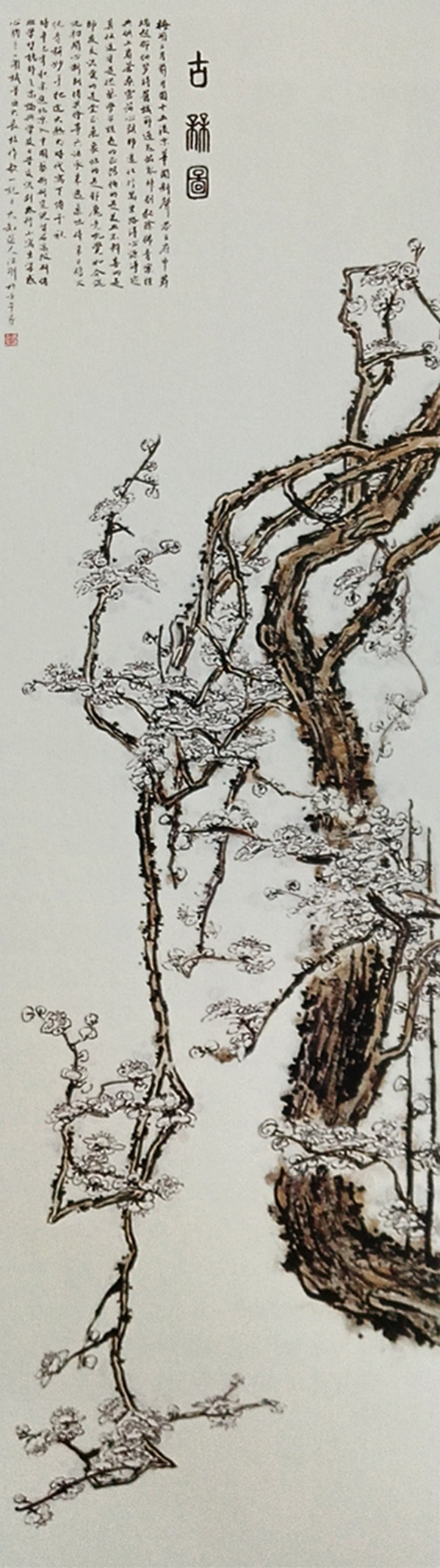 古梅图题画歌:梅开二月前,月圆十五后,京华闻新声,恭王府中筹。揣起那细罗将旧识筛过,鬼、怪、乱、神剔除。拂清案,经典供上,看沧桑,灵满心头,这才是从艺学子该走的正路。怕的是美丑不辨,喜的是师友交流,爱的是堂正气象,恼的是邪魔竟吼!师造化行万里路,得心源净、定、真收!觉如今,混沌初开心渐朗,将其绘事六法承来逸气吐。待来日,炉火纯青称妙手,将这火热的时代写下传千秋。注:2002年余自齐鲁进京,入中国艺术研究院习画。暑月中旬,客居于恭王府中。一日,月上中天之时,独坐于书案前夜读经典,不觉神游物外,静思近年来所见书画,所睹评论,不禁唏嘘感慨。余暴时亦常观历代名家之画作文章,深感今人之书画游于名利场中,陷于偏门旁道,故作上述之文以驳时弊,非诗非词,仅为直书胸臆。现录于上,权于诸君论道耳。