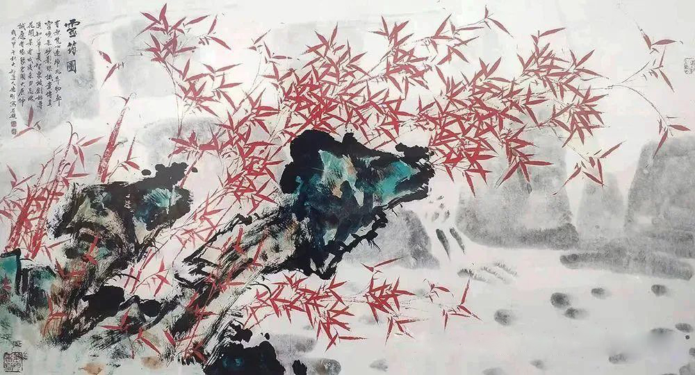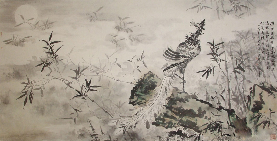 张德刚画竹既有野生之竹,也有水墨淋漓的意象之竹。他在吸收传统竹法的基础上,重在表现竹的清洁空灵之旨,营造竹、物象及环境的情境。《凤凰》是张德刚的一幅佳作。画中的凤凰独足兀立在岩石之上,似回头翘望,山林中的翠竹于云霞里格外清幽,整个作品格调淡雅,传达着他对现实与理想的关怀,寄托着一种士大夫的情调。