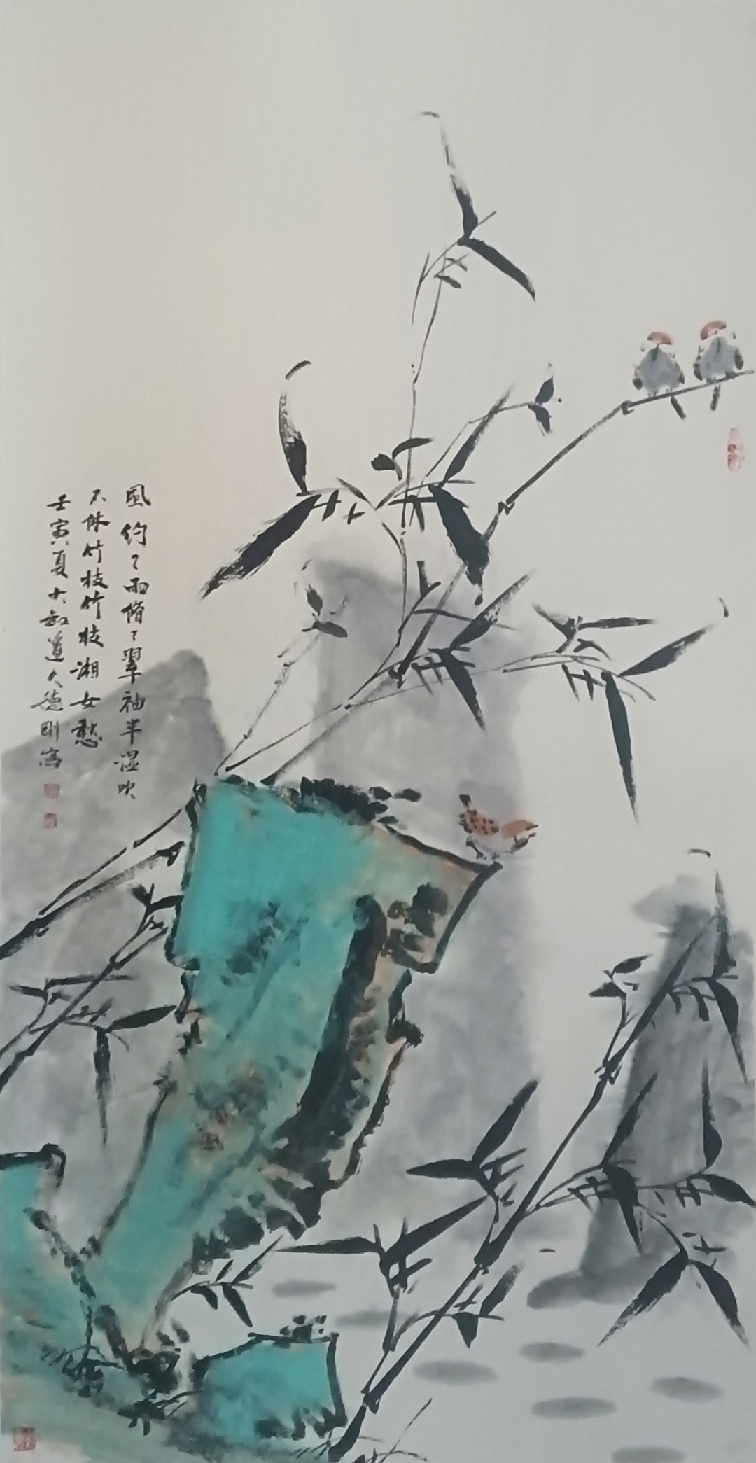 以上两幅作品虽然相隔二十余年,但是可以看到我在中国画创新方面有其独特思路。我最早大学毕业时就打破禁忌开创了人物与山水的有机融合,但那是83年啊!时代误了我啊!人微言轻,并没有引起学术界重视!但是我到北京后在2004年推出新作《竹生荒野外》,立即就引起学术界广泛重视和赞扬!那是山水画与花鸟画相结合的作品!奠定了我的学术地位!诚然这样的创新必须有其基础,而我在山东五七艺术学校(山东艺术学院前身,三年中专)、山东艺术学院连续七年锤炼的基本功十分深厚,虽然主攻花鸟画 但是人物画、山水画也是我的强项!