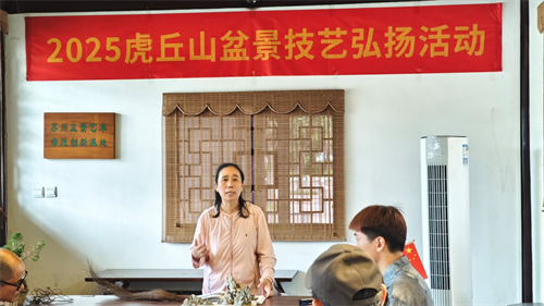 苏派盆景的传承,离不开新鲜血液的注入。苏州旅游职业学院文化旅游研究院谢兰曼副院长在活动中介绍了苏派盆景制作技艺传承的创新做法。她提到,学院实行 “1+1+x” 双导师教学模式,即学校导师与企业导师共同指导学生,将学生输送到各个企业单位中去,让他们在实践中学习成长。谢副院长强调,教学的核心在于人才培养和核心课程标准的制定,要将苏工苏作那份精益求精的匠心精神深深融入到培养方案中,让年轻一代真正理解并传承这份宝贵的文化遗产。