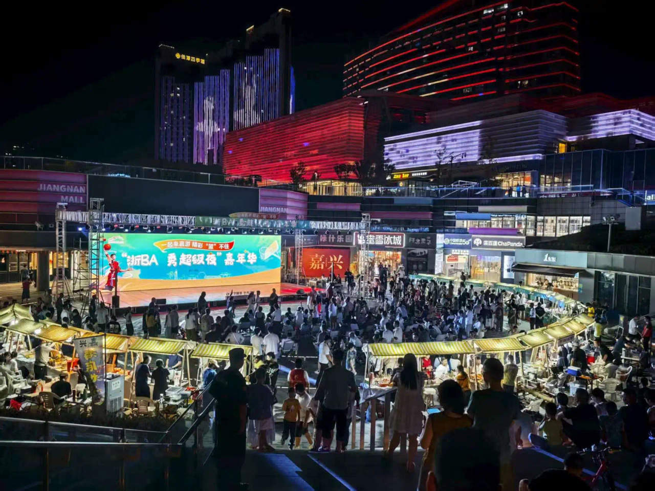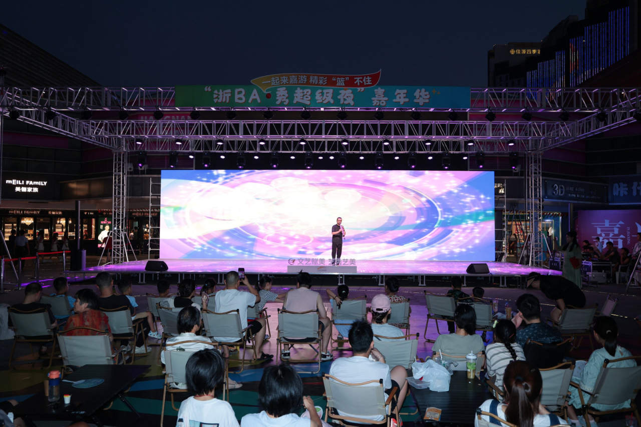 8月17日晚,嘉兴江南摩尔下沉广场化身多彩海洋。随着浙BA城市联赛嘉兴主场赛在秀湖体育中心激烈开战,由秀洲文旅发起、并携手嘉兴市新闻传媒中心共同打造的“浙BA第二现场”——“浙BA·秀超级夜”嘉年华,同步开启首场活动。