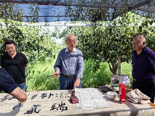 活动的压轴环节,几位书法大师的挥毫泼墨将气氛推向高潮。孙振中、魏廷茂、李清宇等名家即兴创作,以“幸福黄河”“大美黄河”为主题,或行云流水,或苍劲有力,将黄河的壮阔与文化的厚重融于笔端。其中,“黄公梨”三字被书法家以古朴篆书书写,配以小注“清廉如梨,甘甜为民”,引得众人赞叹。