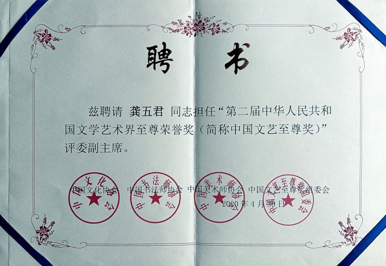 龚五君,中国艺术促进会理事、中国著名画家、国学学会会员、中国文化管理学会会员等等。60周年其作品出纪念专题邮票,入选中国国家博物馆,2005年其作品出过国家级艺术邮票,曾先后在《北京国际艺术博览会》、《艺术与收藏》、《中国艺术家》、《祥和中国》、《中华当代艺术家作品展获奖作品集》、《红色中国》等出书其中国画作品多次获金奖。
