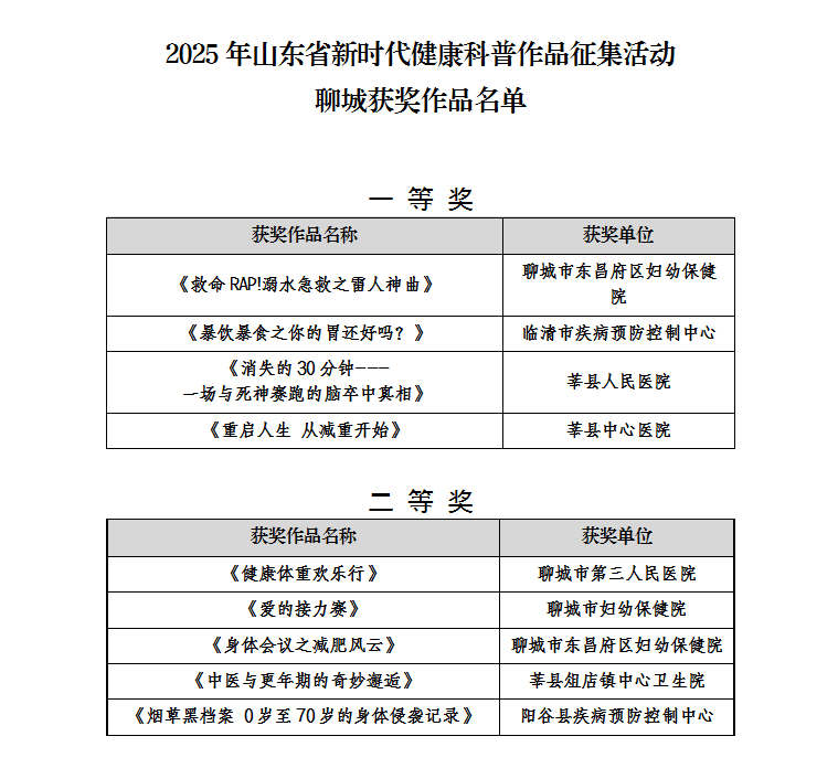 近日,2025年山东省新时代健康科普作品征集活动获奖名单公布,聊城市共有29部作品获奖,其中一等奖4个、二等奖5个、三等奖20个,展现出全市健康科普的创作实力和创新活力。