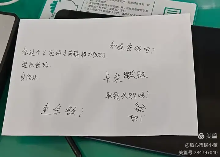 得知赵老师的困境及特殊情况后,徐畅没有丝毫迟疑,立刻取来纸笔,通过文字书写的方式与赵老师耐心沟通。从安抚情绪、说明密码锁死的原因,到告知重置密码的流程、指导填写相关申请资料,每一个环节,徐畅都逐字逐句写清楚、讲明白,全程保持微笑与耐心,用真诚的眼神回应赵老师的疑问。在徐畅的细致引导下,赵老师顺利完成了密码重置手续,成功取出了所需款项。问题解决后,赵老师紧紧握住徐畅的手,脸上露出了感激的笑容,连连竖起大拇指表达谢意。