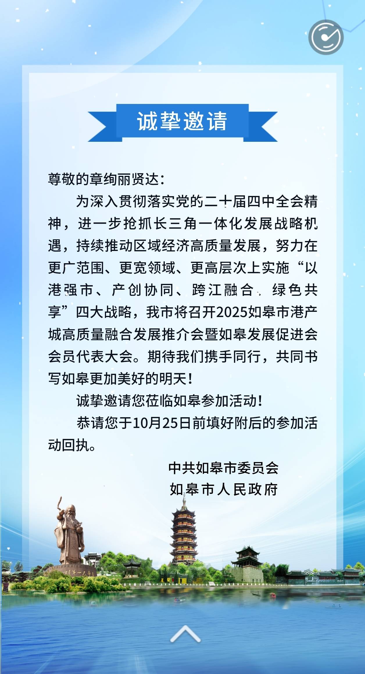 重返故土,每一次归来都能触摸到如皋市强劲跳动的发展脉搏,这份蓬勃生机在岁月沉淀中愈发昂扬。今日这场聚焦‘港产城高质量融合’的盛会,更如一束强光穿透迷雾,让机遇在时代浪潮中熠熠生辉、触手可及。承蒙如皋市委、如皋市人民政府盛情相邀,我得以携家乡人、江苏省作家、招商工作者等多重身份,躬逢11月1号至2号的双会盛事,指尖触到的不仅是会场的暖光,更是故土蓬勃生长的机遇温度,能与各位贤达共话发展、共绘蓝图,为“如意如皋,大起大成”的愿景添一笔绵薄心力,心中满是滚烫的期许与敬意。