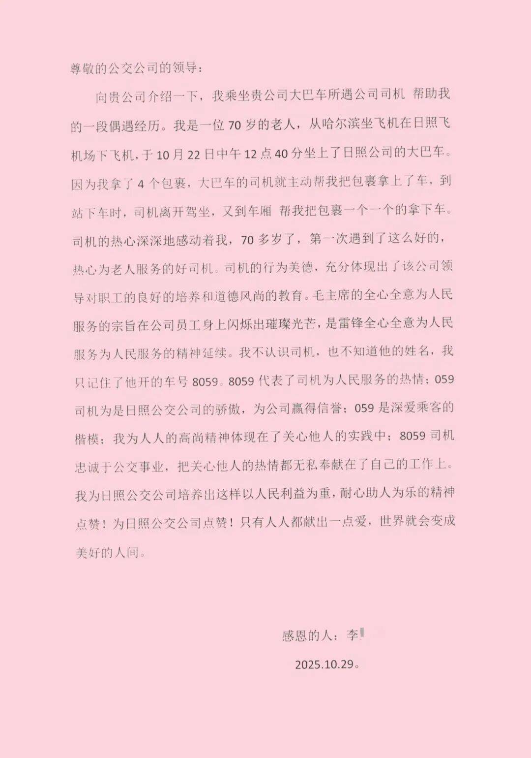 郑世亮的暖心行为深深感动着这位七旬老人。李阿姨在感谢信中详细写道:“70多岁,第一次遇到这么热心为老人服务的好司机。我不认识司机,但在下车时记住了车牌号8059,8059代表了司机为人民服务的热情;8059司机是日照公交公司的骄傲,为公司赢得信誉;8059是深爱乘客的楷模……为8059司机点赞!”