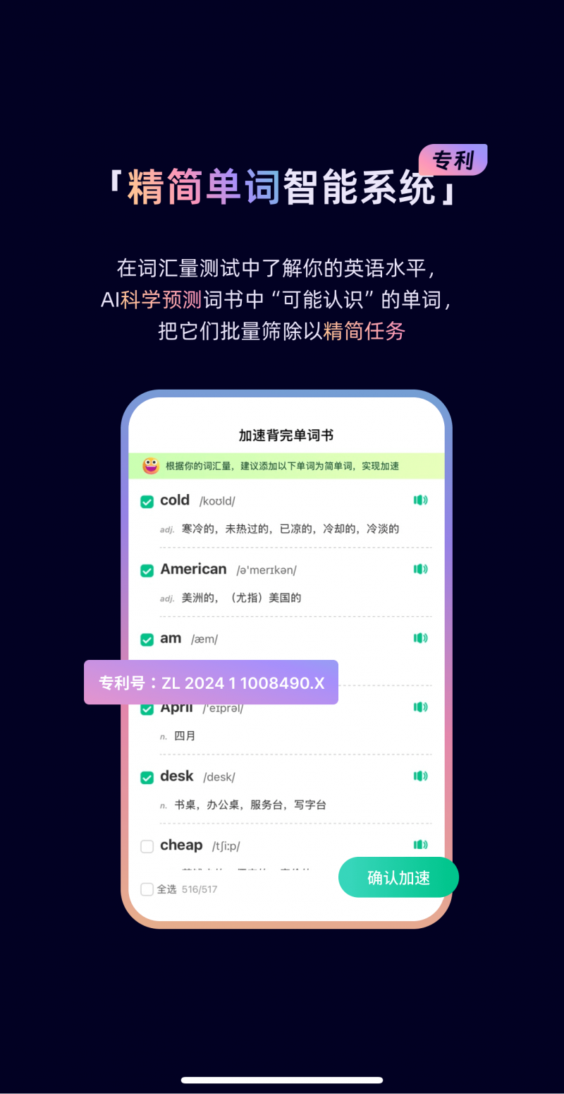 • 采用专利技术(专利号:ZL 2024 1 1008490.X),通过词汇量测试精准预估用户水平;