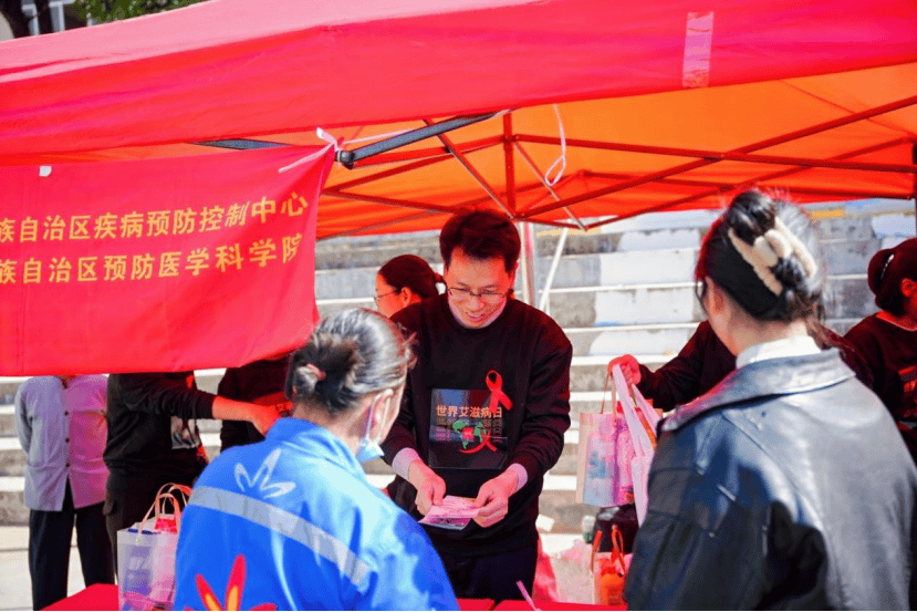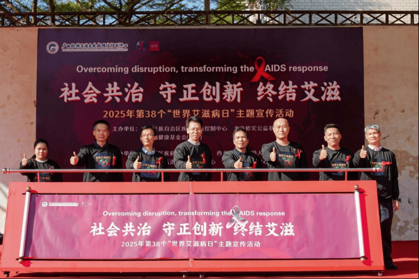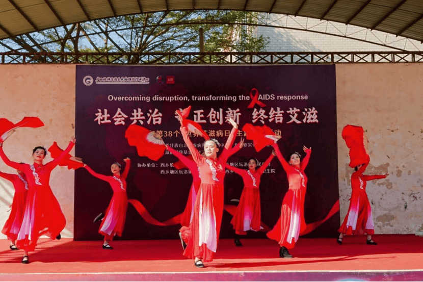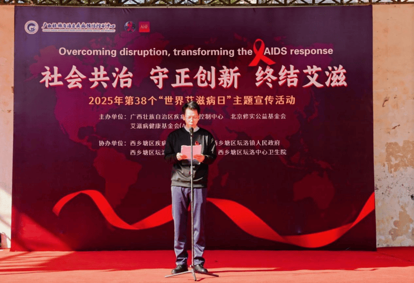 2025年11月27日,在世界艾滋病日到来之际,以社会共治,守正创新,终结艾滋”为主题的2025年世界艾滋病日宣传活动在南宁市西乡塘区坛洛镇举行。本次活动由广西壮族自治区疾病预防控制中心、北京修实公益基金会、艾滋病健康基金会(AHF)联合主办,西乡塘区疾病预防控制中心、坛洛镇人民政府、便民服务中心、坛洛中心卫生院等多家单位共同参与,活动汇聚了来自自治区、南宁市、西乡塘区及坛洛镇的60余名防艾工作人员,并吸引了超过300名村民到场参与。活动在坛洛镇灯光广场设立宣传点,通过文艺演出、互动有奖问答、摆台宣教、免费发放防艾资料等多种形式开展,现场同步提供HIV快检与健康体检服务。累计发放宣传资料千余份、安全套2500只,完成HIV快检89人,宣传覆盖近2000人次。