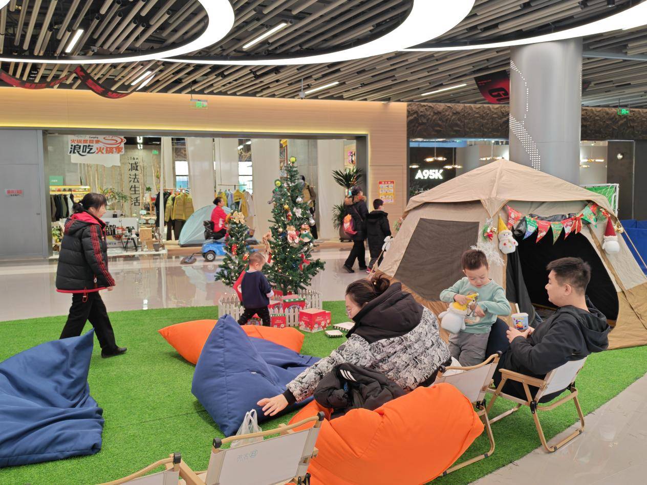 室内露营+打卡出片,定格双旦温馨慢时光 运动过后,“动感all运村”室内露营场景为大家提供惬意休憩空间。区域以“自然、舒适、松弛”为基调,大面积铺设柔软草坪地垫,搭配错落有致的露营帐篷与可爱圣诞装饰,将户外露营的惬意感搬进商场。这里既是运动后的能量补给站,也是双旦拍照打卡的热门点位,暖融融的氛围与运动场景的活力形成巧妙互补,让人们在感受运动激情的同时,也能收获一份双旦专属的温馨与放松。