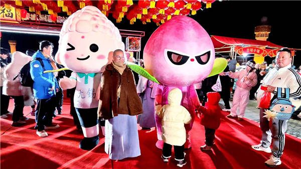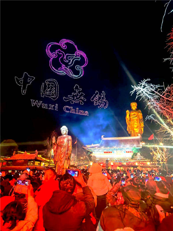 活动当晚,零点烟火无人机盛大开演,2026架无人机编队呈现“佛光圣景”“吉祥祝福”“城市荣光”“苏超热点”等动态画卷,与20000发高空礼花交相辉映,营造出璀璨震撼的夜空盛宴。在祥符禅寺,庄重的撞钟祈福仪式如期举行,108响钟声涤荡心灵,承载着游客们对新年最诚挚的祈愿。千盏手写心愿的孔明灯同步放飞,与无人机共同点亮星河,勾勒出“天人共愿,灯火绵延”的温暖画卷。此外,非遗“药发木偶”、国潮火焰秀、民俗雅趣百戏及福运互动市集等环节,也为游客带来了兼具文化底蕴与沉浸体验的跨年仪式感,不少游客表示:“在灵山跨年,既能看到震撼的科技秀,也能感受传统文化的温度,是一次非常难忘的体验。”