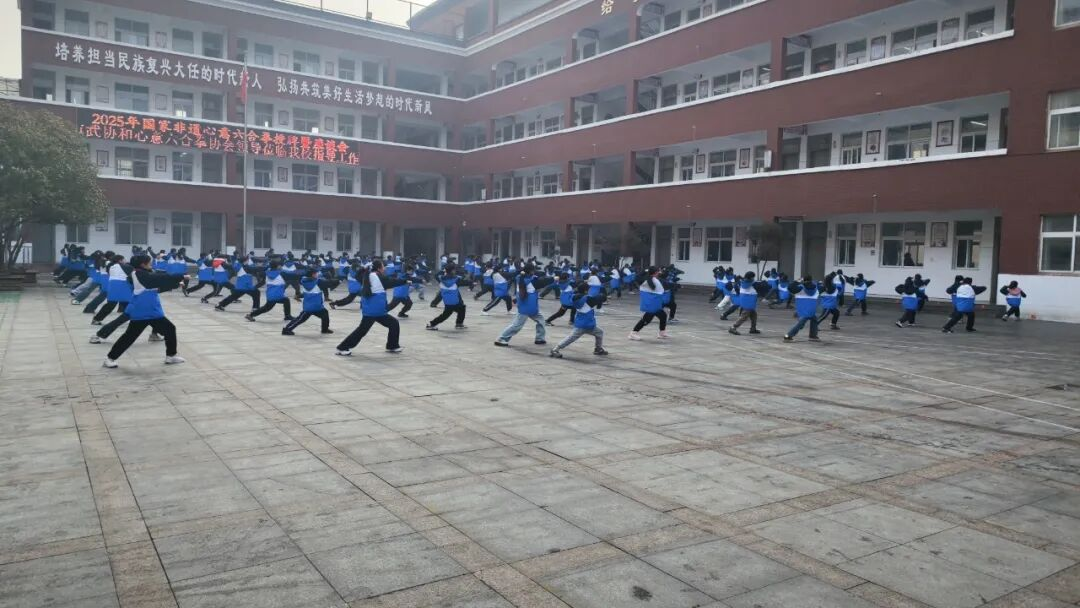 活动伊始,校领导在校门口热情迎接武协同仁的到来。东操场上,我校武术社团的同学们精神抖擞,身着整齐服装表演《千字文》武术操。一招一式刚劲有力,一呼一吸节奏感十足,将传统武术的阳刚之美与经典文化的儒雅底蕴巧妙融合。孩子们用稚嫩却坚定的动作,既展现了非遗武术的独特韵味,更彰显了新时代少年扎根传统文化、涌动文化自信的昂扬风貌,每一个招式都承载着对民族文化的认同与热爱,赢得在场嘉宾的阵阵掌声。
